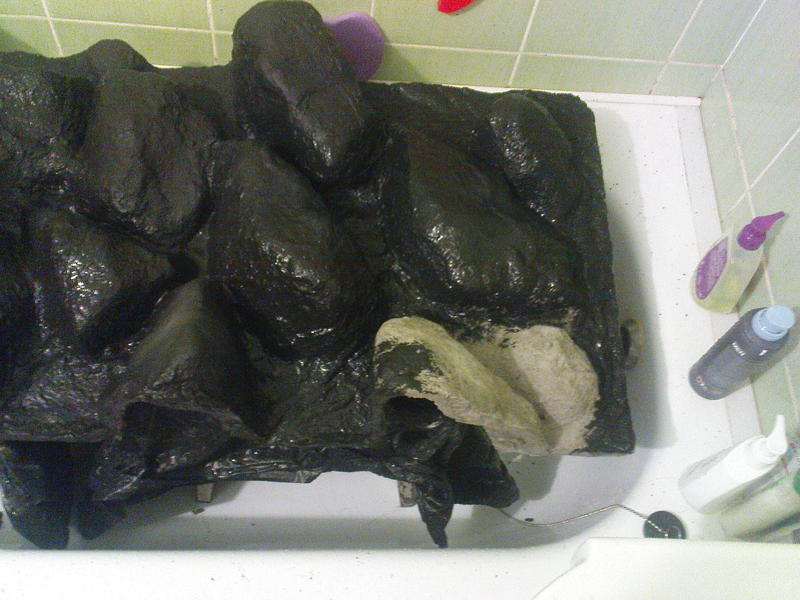 Не использовать пенопласт и мое никудышное художество вообще а выложить фон из натурального камня. Ну а дальше как и раньше, уже камень покрывать субстанцией