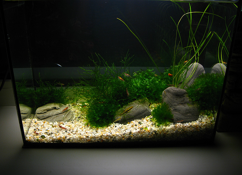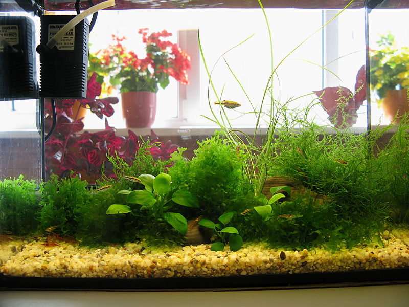 Вот фото, если интересно. И фильтрик там виден. Кстати, аквариум 10 литров. Но только ссори за качество и пятна, это первая попавшаяся фотка. Ну и оформление там сейчас другое, более причесанное.
