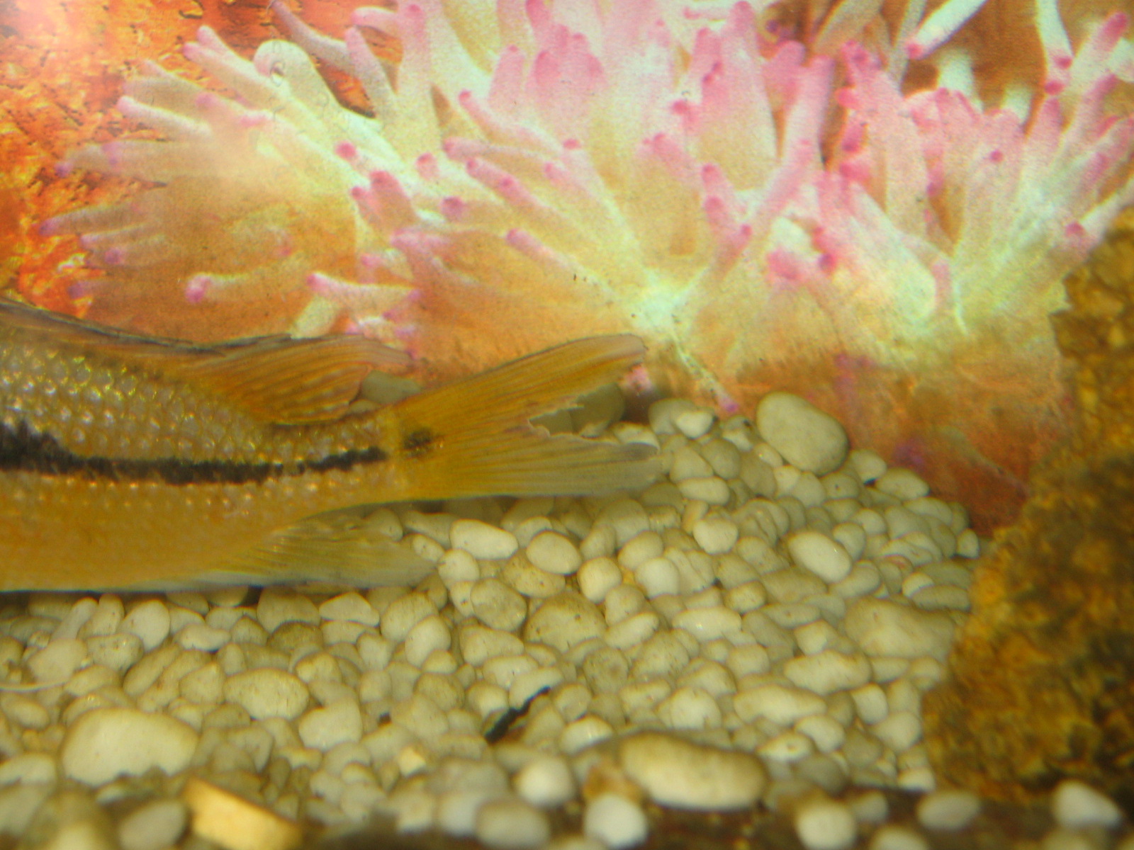 и тут закрались сомнения-самец или вторая самка? Сразу хочу оговориться что полосы какая присудствует на фото обычно нет, только пятно (как у самца, поэтому ранее я и не сомневалась), но и мозаичного ричунка на звосте я не вижу да и спинной плавник не острый и совсем не красный...Прошу прощения за фото-лучше сделать не получилось-рыба в шоке, света в акве щас нет-только то что с окна.