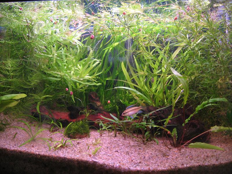 Вода была почти полностью слита(оставила около 0.5 см и немного грунта ), фильтр тоже не фистила. Затем был запарен на сутки торф (вода слита, ), торф был перемешен с Флораполом и выложен в акву, сверху посыпано углем. Затем насыпан грунт (гранитная крошка -опять таки спасибо KSO), положен ракушняк (был до этого в акве) и коряжка (купила мопани-обвязала мохом). Высажены заново растения, залита вода. Вот что получилось...Мопани сильно закрасила воду и сейчас принимает ванны в бочке-дальше будет видно. Лампы были заменены на 2 Гролюкс 15 Ватт. Добавлен по инструкции Ферропол. Свет включался 1 и 2 день-на 2 часа, 2 и 3 день на 3 часа, 4 и 5 день на 4 часа, 5 и 6 день на 6 часов. То что получилось на фото, из проблемм что появились-нитчатка (думаю что удо надо было добавлять не сразу). Проведенные мероприятия-замена 60% воды, без добавления ферропола, сокращения длительности светового дня до 2 часов в сутки. Ждемс.. Предложения и конструктивная критика приветствуются )))