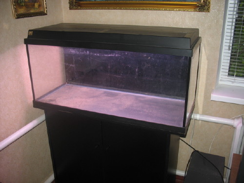 Аквариум в комплекте с тумбой, крышкой, родным объемным фоном. На задней стенке качественно наклеен черный оракал.