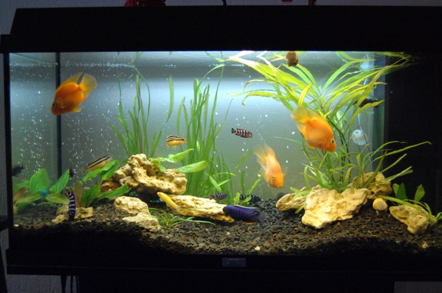 Население - 3 Red Parrot, Аулонокара Ньяса, 2 Золотых меланохромиса, 4 демассоньки, 2 зездчатых трофеуса, гирик и 2 ампуляшки.