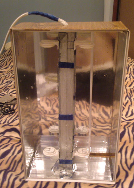 Кришка робилась поступово, спершу купив баласти 2шт. по 15w, потім лампи 14 w Hagen Agua-glo і Sun-glo, потім все інше. У металевих профілях прорізав дирочки для вологозахисних патронів, всередину кинув 2 баласти, під’єднав. В епіцентрі купив жидкі гвозді , силікон , вагонку (26 см ширина, довжина 3м, якщо не помиляюсь). Зклеїв стінки за аналогією http://aquaig.narod.ru/top/mytop.htm жидкими гвоздями. Через пару днів, коли запах від жидких гвоздів вивітрились, в бокових стінках зробив отвори для того щоб просунути профіль з металу, і з зовнішньої сторони загнув його, всередину залив силікон для кращої герметизації, потім бічні стінки заклеїв картоном. Наглядно викладаю ілюстрацію внизу.