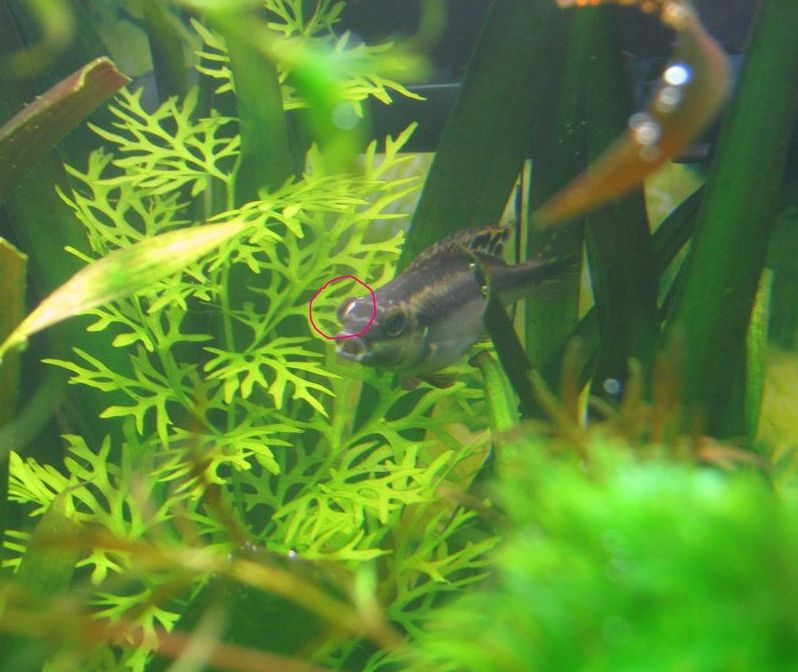 Помогите пожалуйста определится с диагнозом. Пельматохромис крибенсис (попугай) - пару дней назад заметил, что один глаз начал "выкатыватся из орбит"