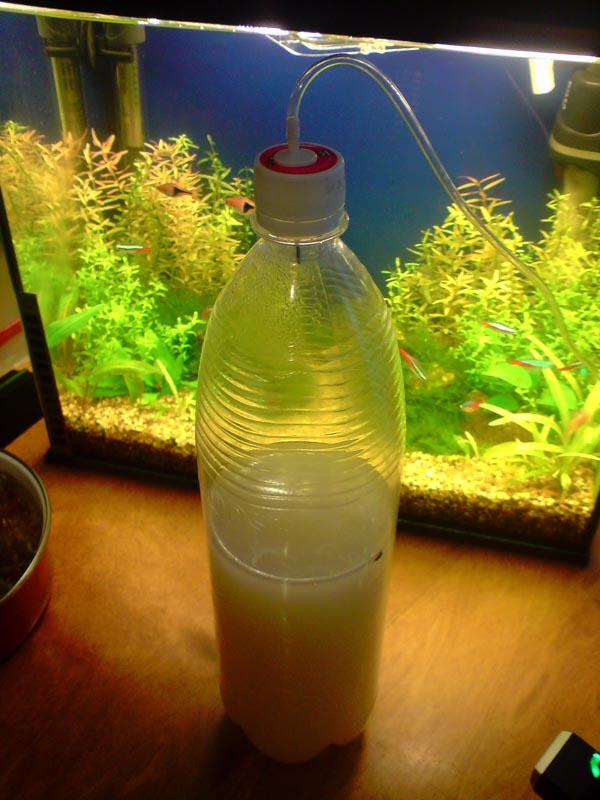 Сделал себе самую простую систему бражки из возможных (на фото). Бутылка, воткнутая иголка от капельницы, на другом конце трубки - рябиновая веточка. Отлично работает, классно растворяет. Кроме того, безопасность на уровне - при аварии с бутылкой/трубкой вода из аквы через рябину не потечет.