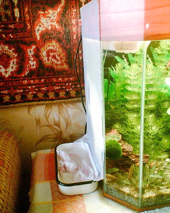 Берете х/б ткань по ширине одной из выбранных Вами стенок аквариума. Длина ее должна соответствовать высоте аквы + 20-30см. Вполне подойдет старая простыня или, еще лучше марля в несколько слоев. Намачиваете ее, слегка отжимаете и плотно и равномерно прижимаете к стеклу. Нижнюю часть ткани опускаете в какую- нибудь емкость с водой