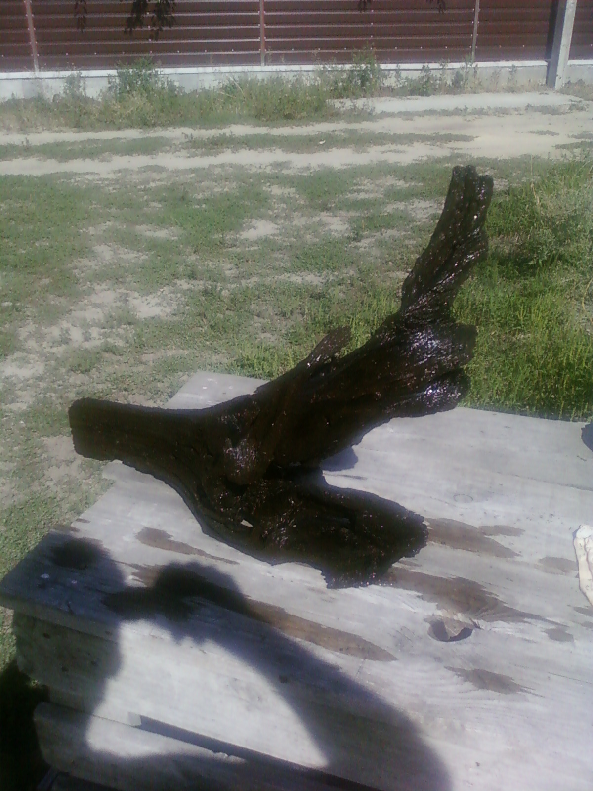 сушил возле камина, почистил, потом варил, но она не влезла вся в огромную кастрюлю и варил ее частями время от времени переворачивая...выварив она не утонула... потом я ее кинул с водой в 200 литровую бочку на улице, верхушка замерзла (так как зима) и коряга как бы получилась в воде...