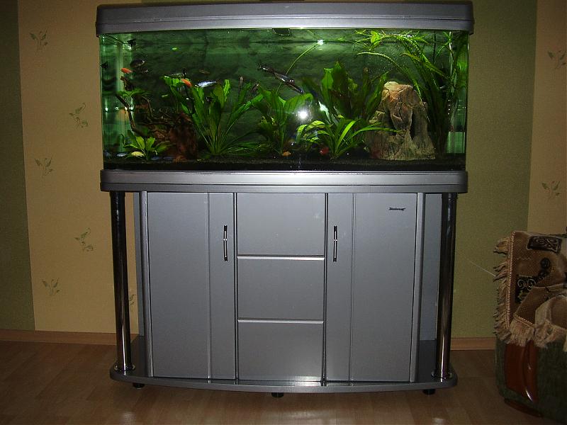 Был у меня аквариум на 200 литров и вот я решил прикупить себе аквариум побольше. Вот что из этого получилось. По каталогу китайской фирмы Jinlong выбрал я себе аквариум на 426 литров (так было написано в каталоге) с тумбой, с параметрами 128*68.5*48, серии RE 5128. Высота аквариума, по каталогу, измерялась вместе с крышкой, т.е. я прикинул сколько может иметь высота крышки и прикинул реальную высоту (где-то 60 см.). Тоесть по моим подсчетам аквариум должен был быть где-то на 360 литров. Когда мне его привезли и я его установил, оказалось что высота аквариума даже вместе с крышкой становит 62.5 см! Ширина даже в наиболее выпуклой части (переднее стекло выпуклое) становит приблизительно 43 см.! Только длина оказалась более-менее как в каталоге. Так вот мой аквариум получился на 270 литров (на 150 литров!!! меньше чем по каталогу) И получилось, что я хотел поменять свой 200-литровый на больший, а поменял на 270-литровый, т.е «шило на мыло». Хотя к самому аквариуму у меня претензий нет (дизайн аквариума и тумбочки мне нравится). Стекло переднее без швов. Есть много серий аквариумов Jinlong. И исполняются они в трех цветах: под дерево, под бронзу и под серебро. У меня под серебро.