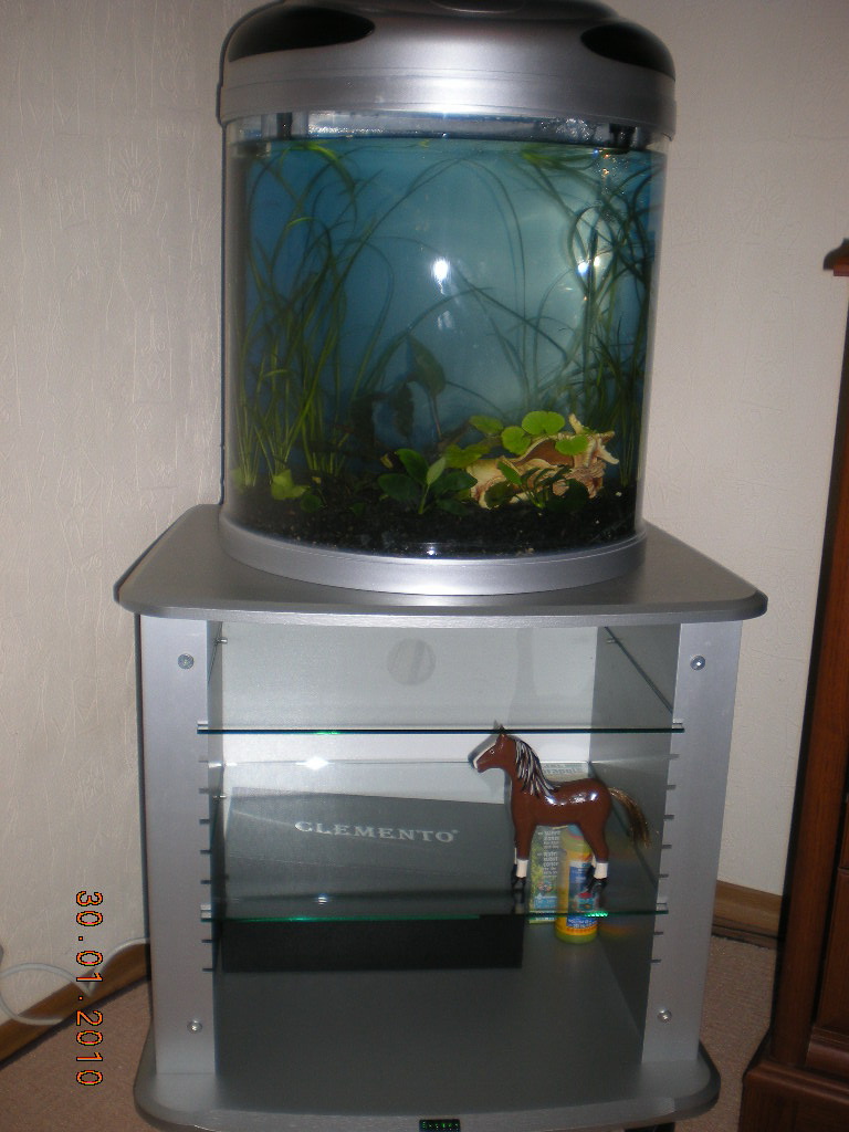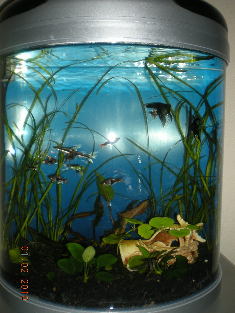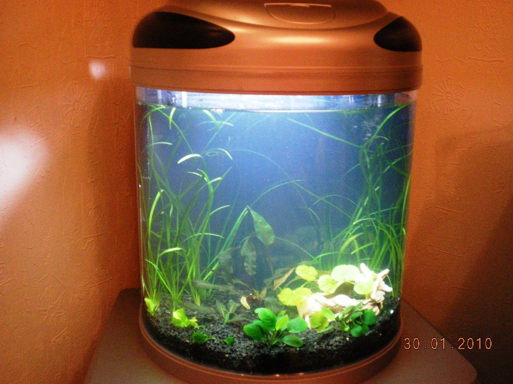 P.S запущен был в субботу, в воскресенье посажены растения, в понедельник утром креветки, и вечером, в тот же понедельник рыбы. Фильтр встроен в аквариум, в трубку наливается вода, поднимается вверх, там проходит, через вату, типа, шарики керамические и уголь, и вытекает обратно в аквариум, компрессора и помпы нет, мне сказали в маге, что и этого хватит, когда вода из фильтра выливается в воду, то тем самым обогащает кислородом, t 26.