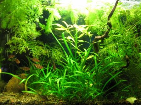 Растения: анубиас нана, стрелолист, наяс, яванский мох, немного глосистигмы, небольшие ветки гигрофилы, кабомбы, бакопы, апоногетон живородящий, криптокорина.