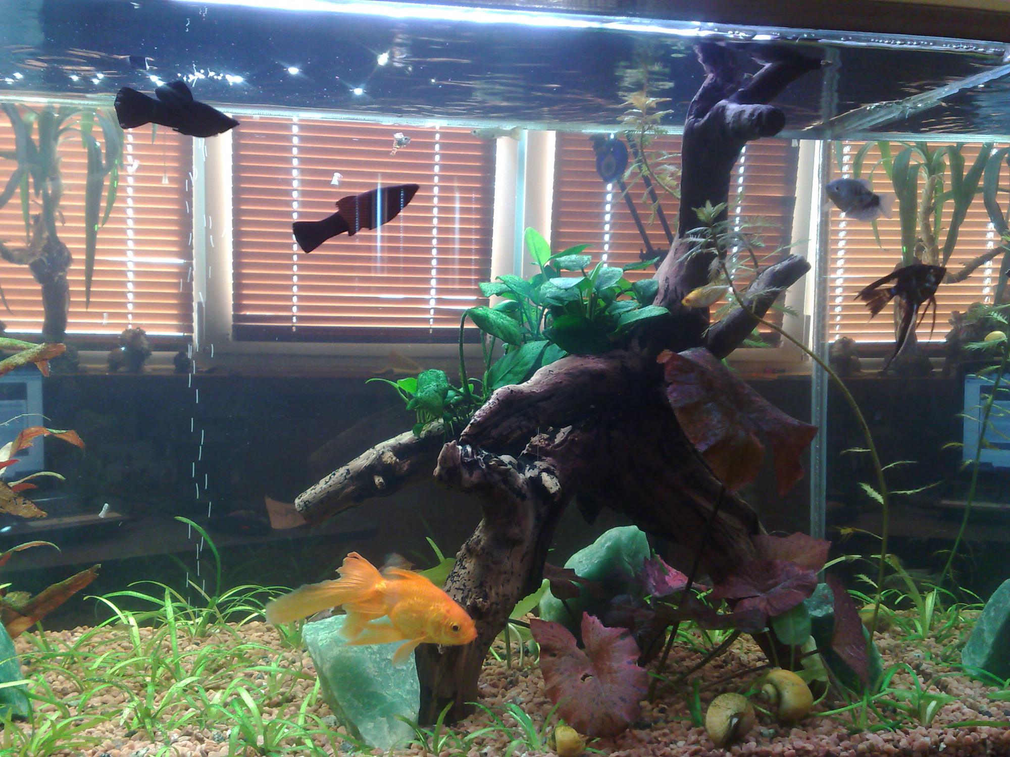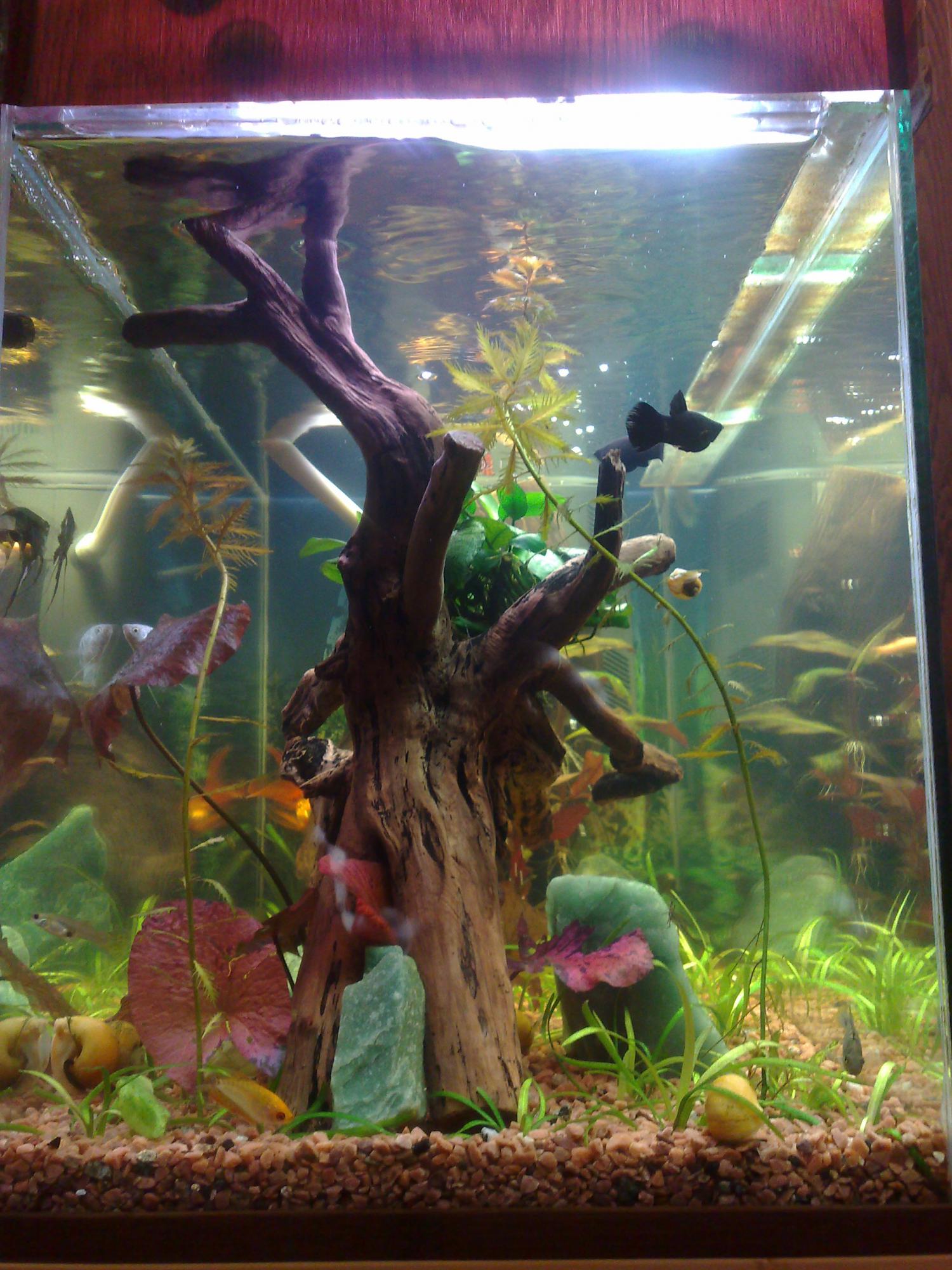 Очень красивая коряжка и анубиас нравиться,как прикреплен.Наверное планируете добавить растений?Было бы лучше...Золотухе надо бы со временем переехать в другой аквариум...Вообще то компания не очень подходит и вряд ли уживутся между собой...А когда появится фон и растений побольше,будет очень красиво.