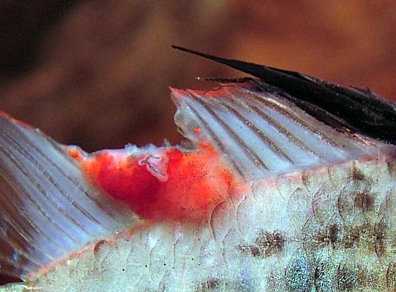 История: по спинному плавнику у рыбки идет природная окантовка красного цвета. Через 3 месяца после приобретения на двух лучах плавника эта акантовка начала видоизменяться: появилось утолщение. Было впечатление, что к плавнику прилип мотыль. Через какое-то время этот "нарост" пропал - как отвалился. И два луча плавника были на 1/3 короче остальных. Долго не отрастали. Сейчас ситуация повторилась, но в осложненной форме. На спинном плавнике возле самой спины - как объемная опухоль.