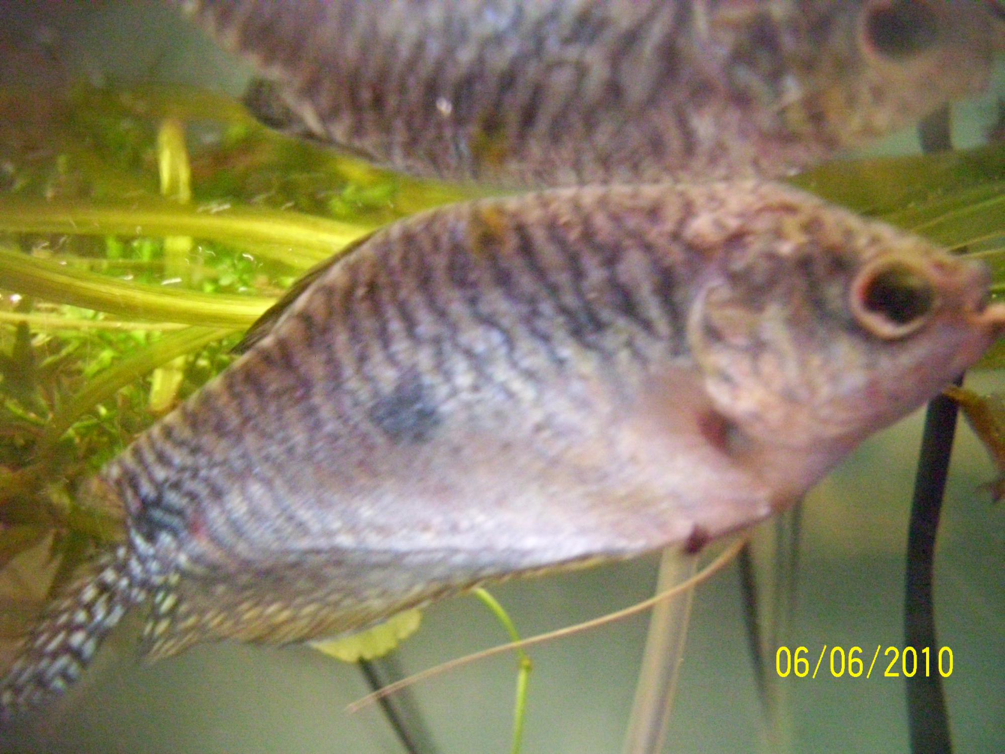 Еще сегодня заметила,белые пятна на чешуе(на спине),диаметром примерно 0,5-1 мм , а также не знаю как назвать,похоже на белые выступы, то на какую-то белую плесень(1-1,5мм)...Последние выступают из тела рыбы и пропадают,а на их месте остаётся нечто похожее не язвочку.