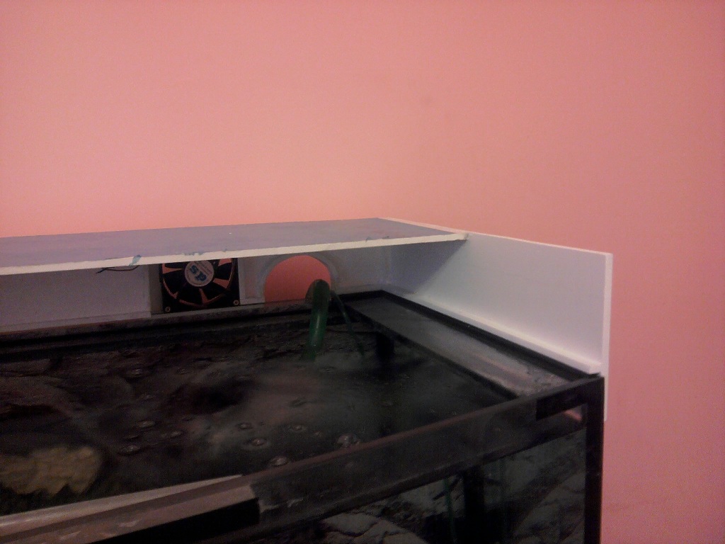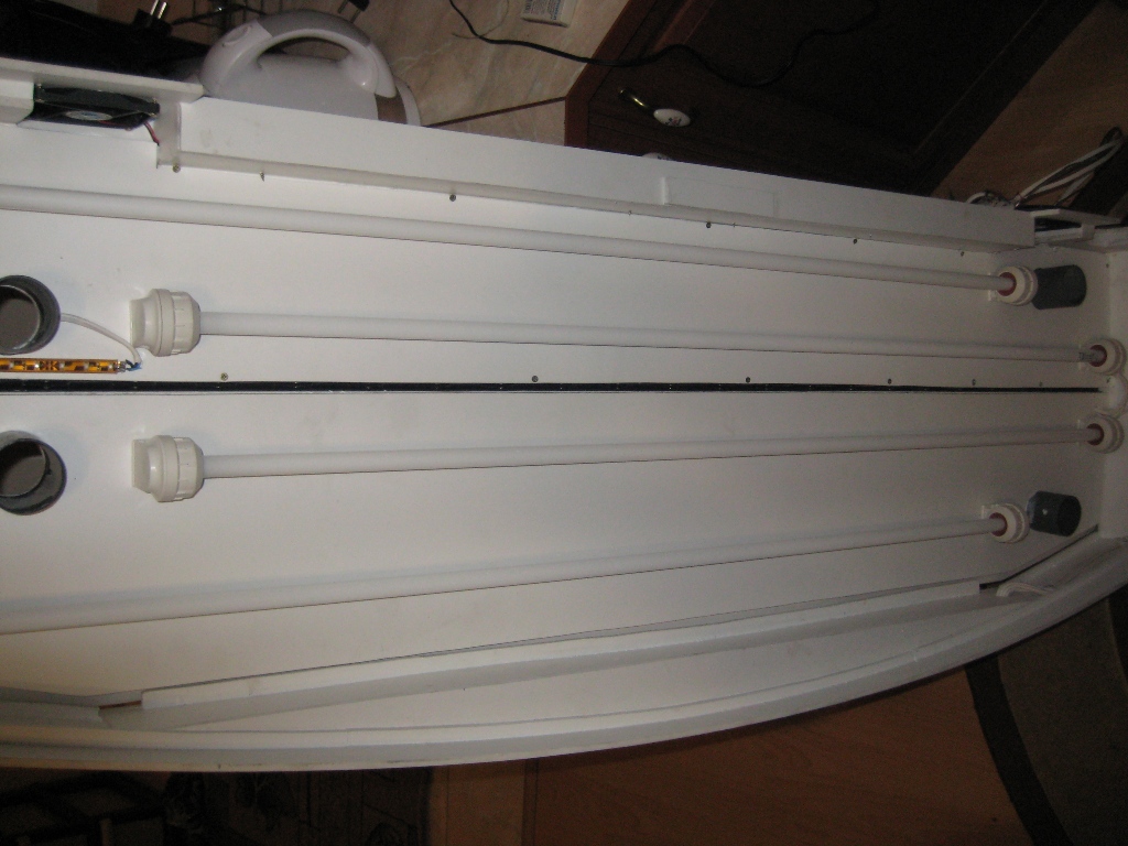 Для лучшей вентиляции сверху высверлил 4 отверствия, до каких приклеел сеперклеем трубу обычную канализационную (Plasti-fix только до ПВХ, иные материали не клеет) а все швы промазал клеем Plasti-fix, держит мертво. Трубу нарочно вывел ниже уровня ламп, таким образом на потолке нету солнечных зайчиков. Труб можно сколько угодно, это как фонтазия заиграет.