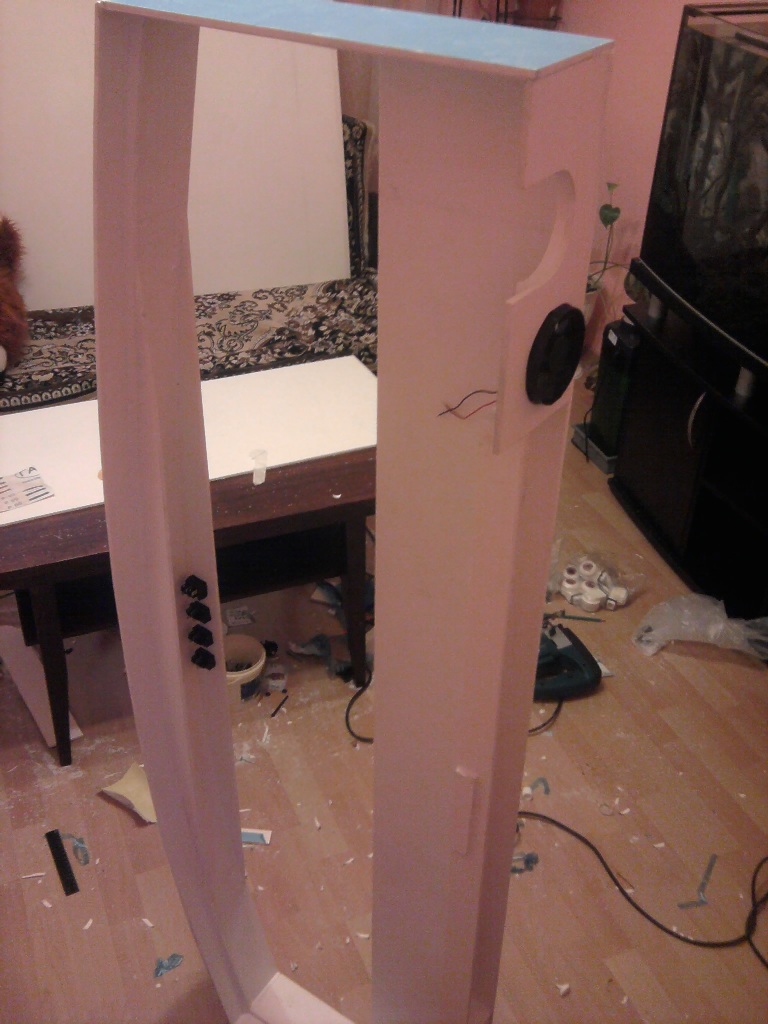 потом поставил крышку на акву и измерял на акве до миллиметра + запас 5 мм( если б неделал запас то не влезла б крышка на акву).потом тот угол что шел на стык, обрезал его ножом под 30 градусов примерно чтоб площа стыка больше была и приклеил клеем без каких-то обробок просто помазал и прижал на минуту (благо клей очень хорош). Если спереди только одна часть наклеена то оно получается оч. хлипкой, поэтому я делал спереди на овале панельку, прикрепив еще ребрами. В итоге перед получился очень прочный и с панелькой вообще не прогнуть руками.