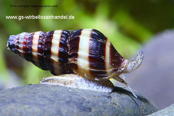 Очень эффектная, янтарно-черная, с четко выраженными границами полос раковина Anentome helena, привлекает внимание и украшает аквариум. Интересна и форма ноги моллюска - удлиненная, а голова в форме хоботка.