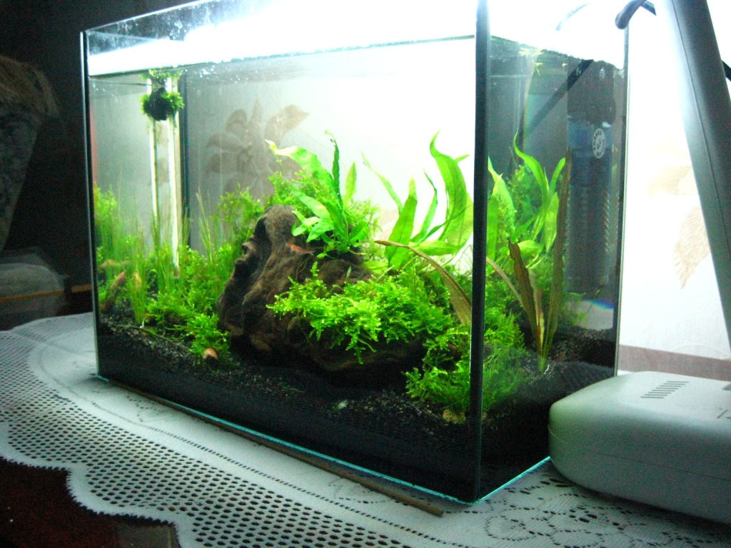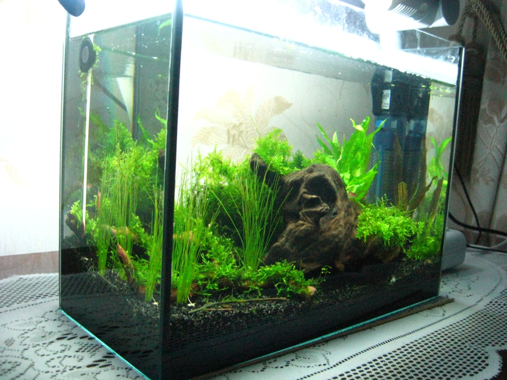 Вот мои первые попытки в оформлении мини акваса для креветок и в самом содержании креветок. Запустил его месяц назад, объем 11л.