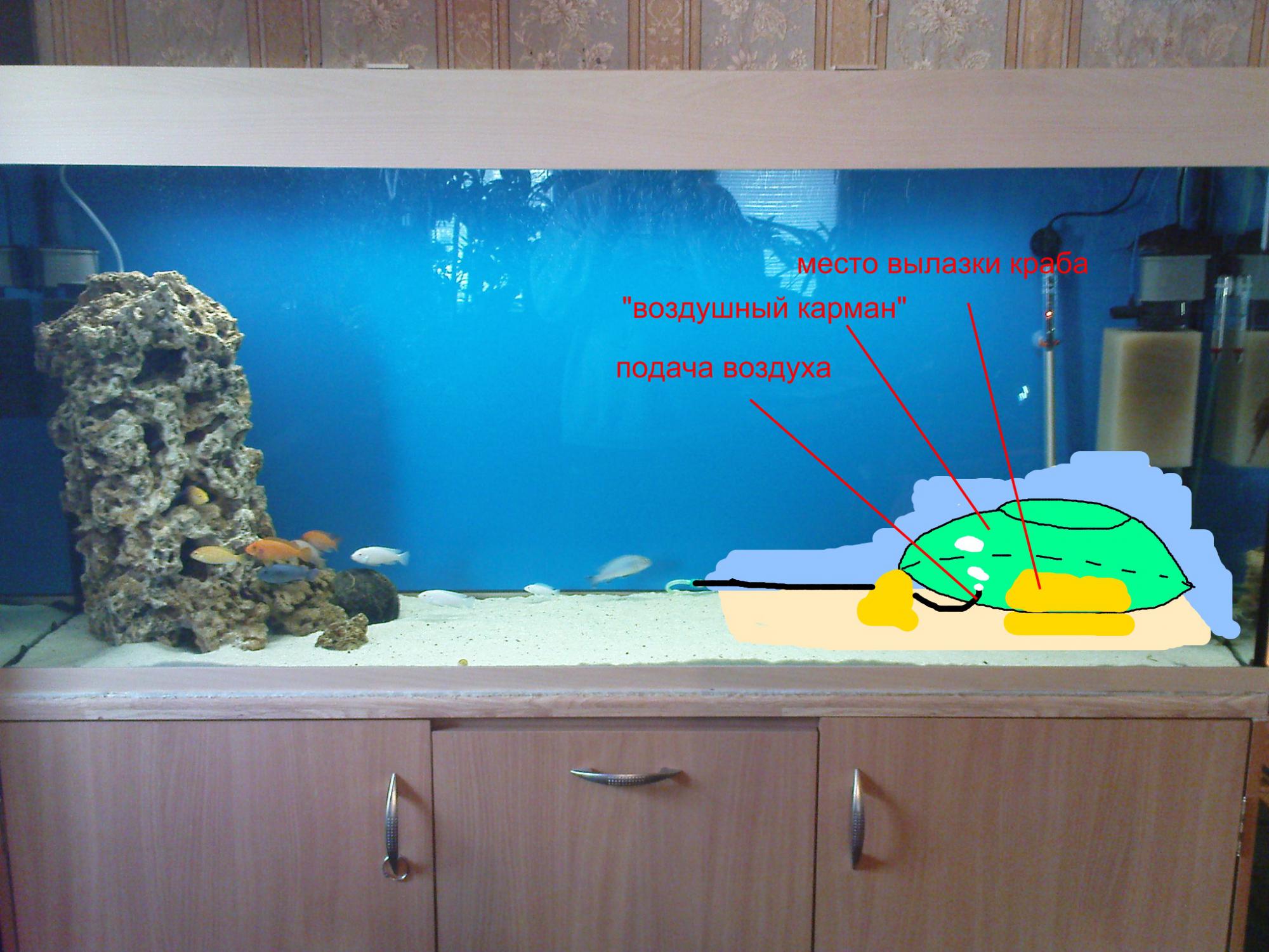 Теперь мне загорелось запустить туда крабика для пущего эффекта...А ему,злодею,нужен выход на поверхность.Проблема в том что банка высокая (70 см)...И вот придумалось мне смастерить ему,что то типа "воздушного кармана" прямо на дне,что бы на верх и не надо было карабкаться..