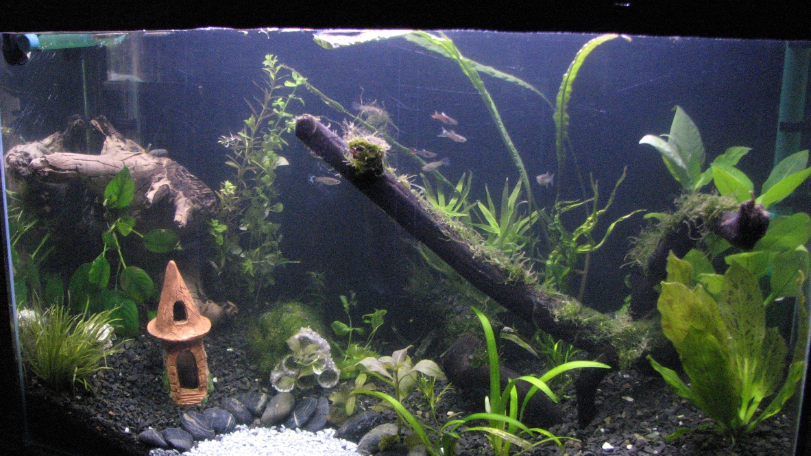Я бы засадила заднюю часть длинностебелькой, а переднюю оставила как есть. Будет выглядеть как сказочный лес с поляной и домиком  , хотя даже уже сейчас вид аквариума вызвал такие ассоциации