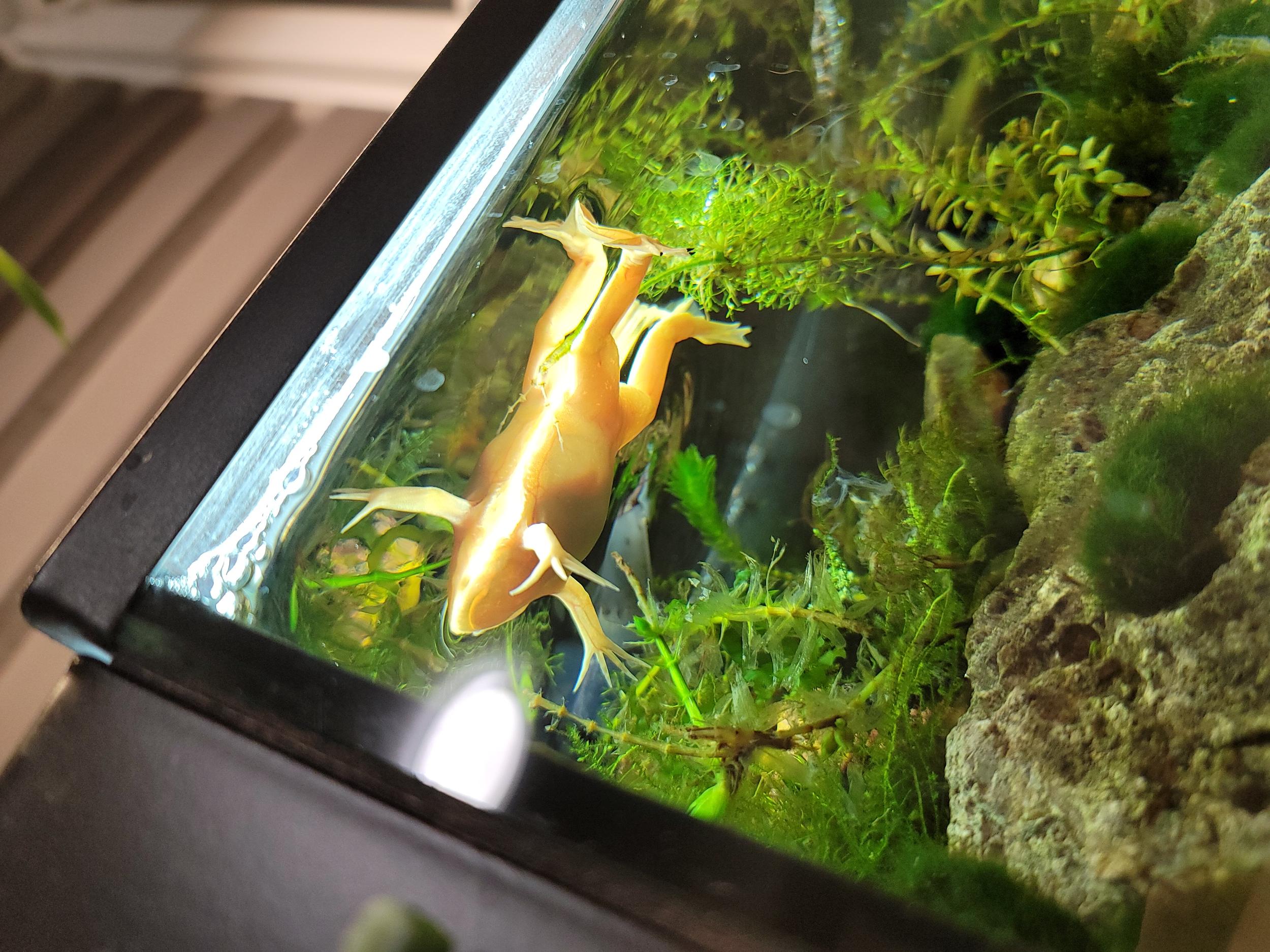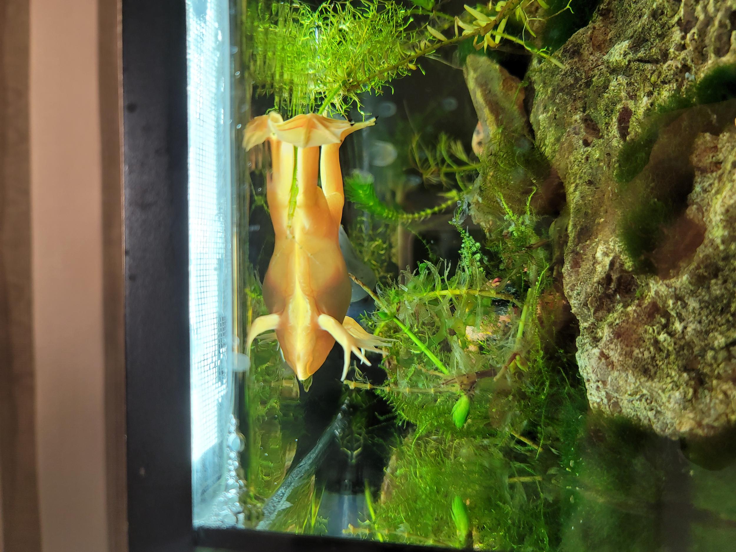 Больше недели назад покормил мотылем, после этого лягушка не может нырнуть под воду, постоянно висит сверху, её что-то выталкивает. Аппетит есть, активная. Может она так уже больше недели, я не замечал так как в последние пару месяцев очень загружен по работе, не наблюдаю за аквариумами. Подмены регулярно раз в неделю 30%, фильтрация хорошая, вода водопровод.