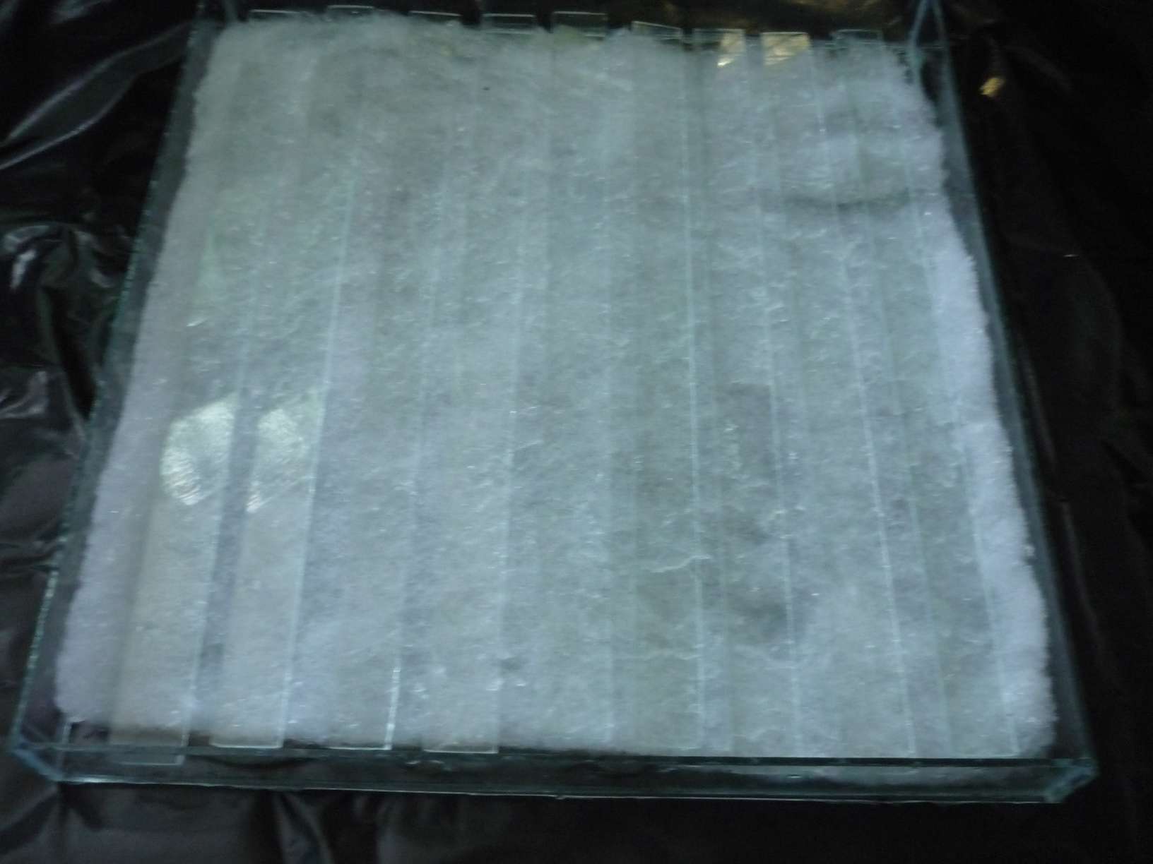 Сверху на синтепон положены стеклянные полосы. У меня их получилось 9шт. Ширина полос примерно 2, 5см длина 44см, то есть полосы практически на длину всей коробку. Полосы уложены в коробку не вплотную, между ними расстояния около 1см. (фото 3)