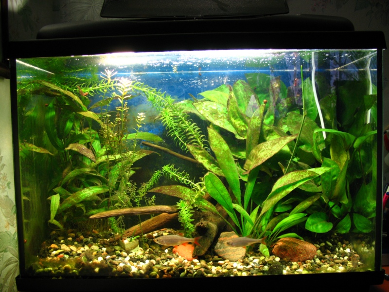 я меняю воду 2 раза в неделю по 1/3 + лёгкая поверхностная сифонка , а раз в 2 недели сифоню основательнее. удо не использую. стоит брага без дозатора что сбродило то и в аквариум (наверное это плохо). водорослей нет, на коряге висят остатки бороды (висят уже год без динамики). вот так выглядел мой аквариум до регистрации на белорусском форуме.