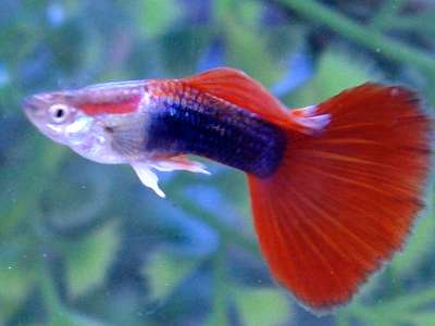 Есть 6 - 7 штук молодых самок гуппи. Генетически - смесь берлинских (красных получерных) и московких алых (красное стекло). Самцы от них получаются в основном такого вида - получерные красные (фото из инета). Но! бывают и с красными корпусами и хвостами от красных до коричневых. Некоторые самки могут оказаться беременны.