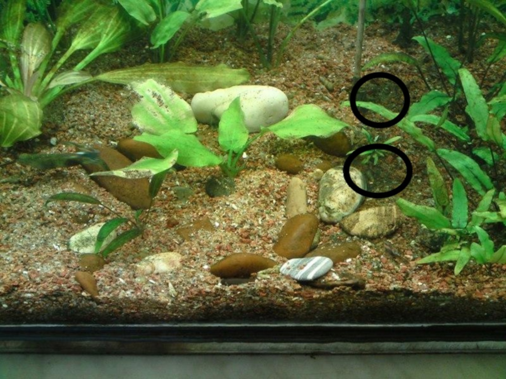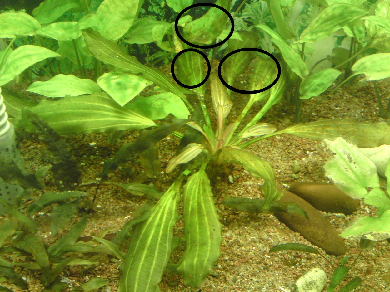 Проблема заключается в том, что в конце декабря 2010 перезапустил аквариум (до этого 4,5 года только сифонил дно да перемывал внешний фильтр) Аквариум - 250л (100х50х50см), две лампы Philips 30W/33 (поменял тоже в декабре). После этого все растет плохо: эх. Озирис раньше вылезал из аквариума, не успевал стрелки обрезать, а теперь старые листья покрылись коричневым налетом, новые - маленькие совсем. Коричневый налет и на камнях и на стекле. Сейчас немного пошли в рост криптокорины: Балансе, Афинис, Лютея, Вендта, понтедериеволистная. А вот эхинодорусы никак не растут. А на грунте постоянно образуется налет темно-зеленый (как тина). Подскажите что к чему. А еще раз в неделю заливаю бутылку газированной питьевой воды 2л. На фото обозначил кругами места на грунте с обрастанием и листья с коричневым налетом.