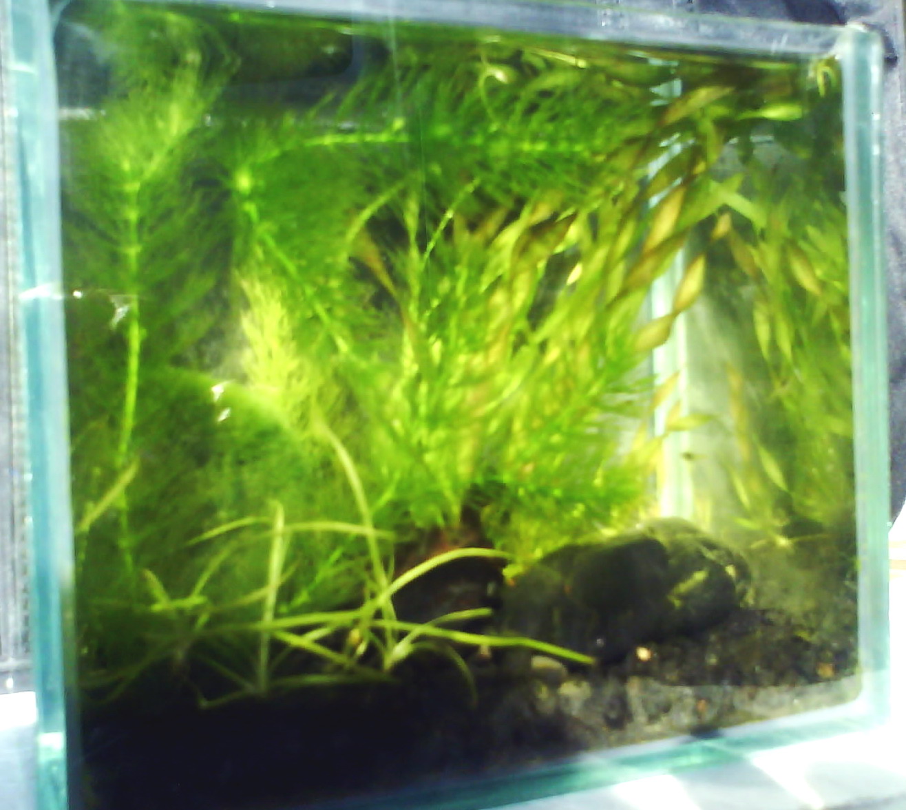 Шо ви говорите? В этих аквариумах, как и в других моих микриках,фильтр и втулить-то некуда. А живут годами. Воду меняю от случая к случаю. Куча валлиснерии выросла в литровом аквариуме за год. Другие микрики у нынешних клиентов попробую сфотографировать. У давнишних - уже не получится.