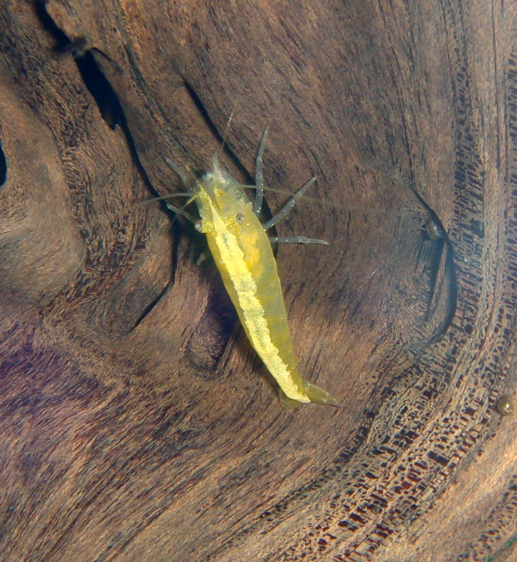 Самки у Neocaridina всегда крупнее и ярче. Именно они чаще всего служат украшением креветочника. Подопытная - яркий (честно говоря, далеко не самый яркий в потомстве) представитель женского полу. Молодая, около 3 месяцев от роду, девственница (седло набрано впервые).