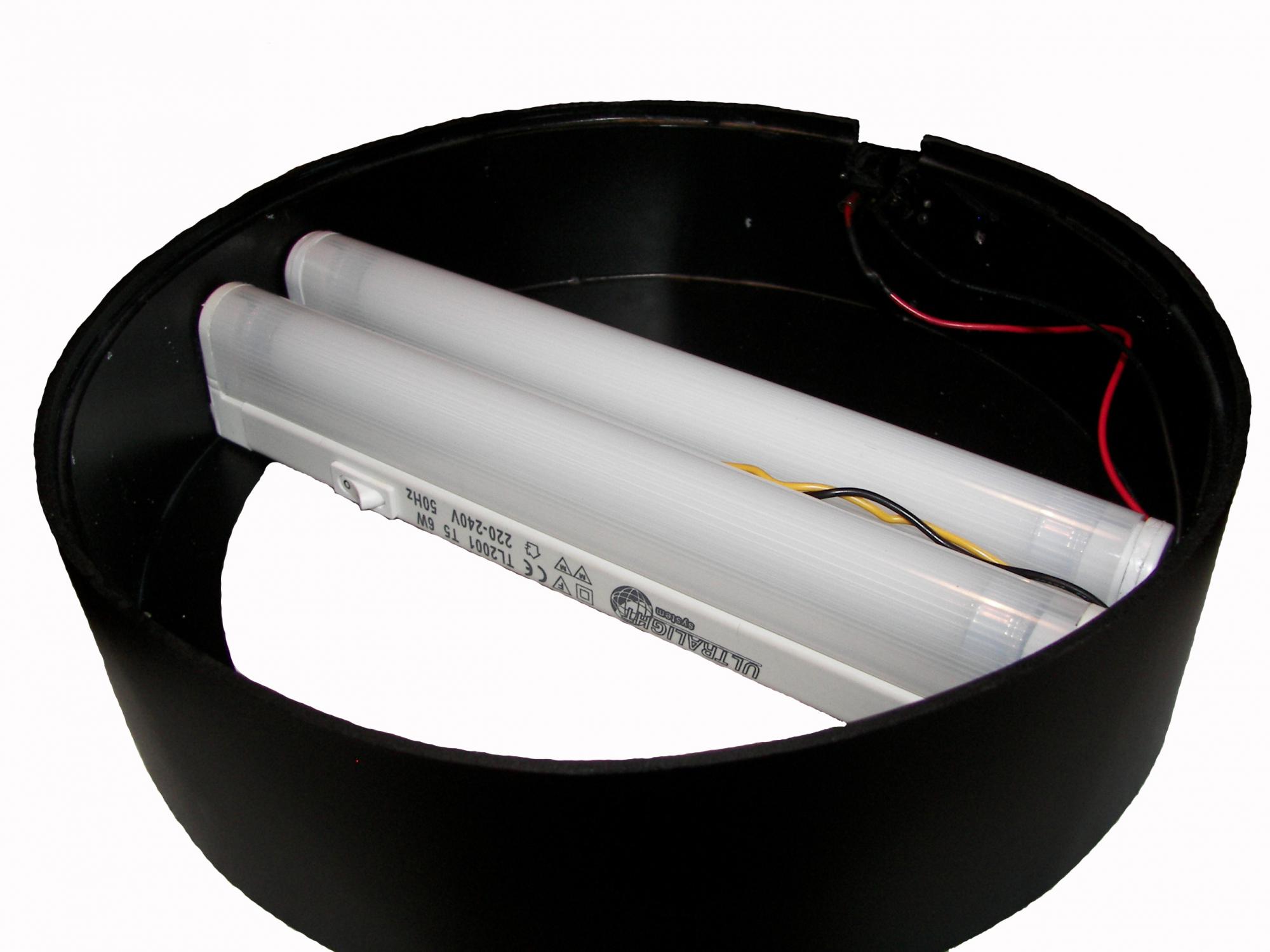 Так как бюджет был ограничен, да и подкрышечное пространство тоже, было принято решение ипользовать для освещения компактные китайские светильники с лампами по 6 Ватт (Итого 12 Ватт для аквариума объемом 12л!). Их преимущество в уже готовом вмонтированном в каждом ЭПРА и цене. Однако и эти светильники оказались длинными, потому пришлось их укорачивать (на рисунке заметны швы на корпусе) и по-новому склеивать и герметизировать. Вобщем получилось бюджетно!