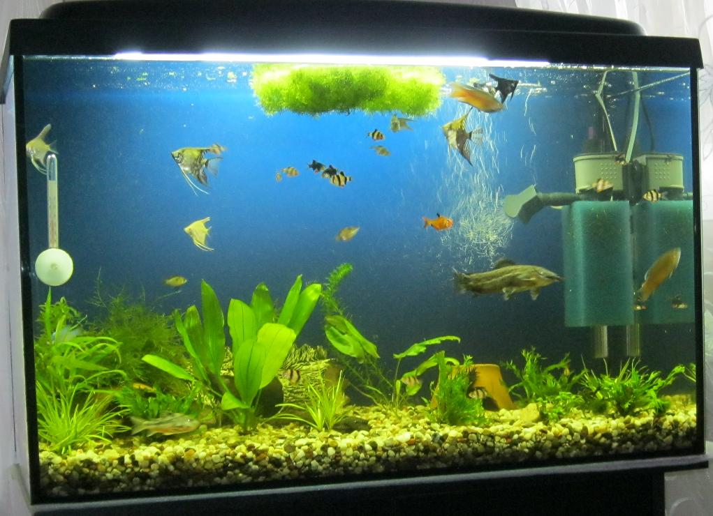 Имеется в наличие стандартный аквариум на 140 литров(800х350х500) и крышка ("природа") к нему. В крышке стоят стандартные лампы (2 шт.) тип Т8, d=26 мм, цоколь G13, мощность - 18В, свет. поток -960Лм, цвет. температура 6300К. В аквариуме живут растения (лимонник, криптокарина, валиснерия, мох яванский, папоротник тайландский, бликса) и рыбы.