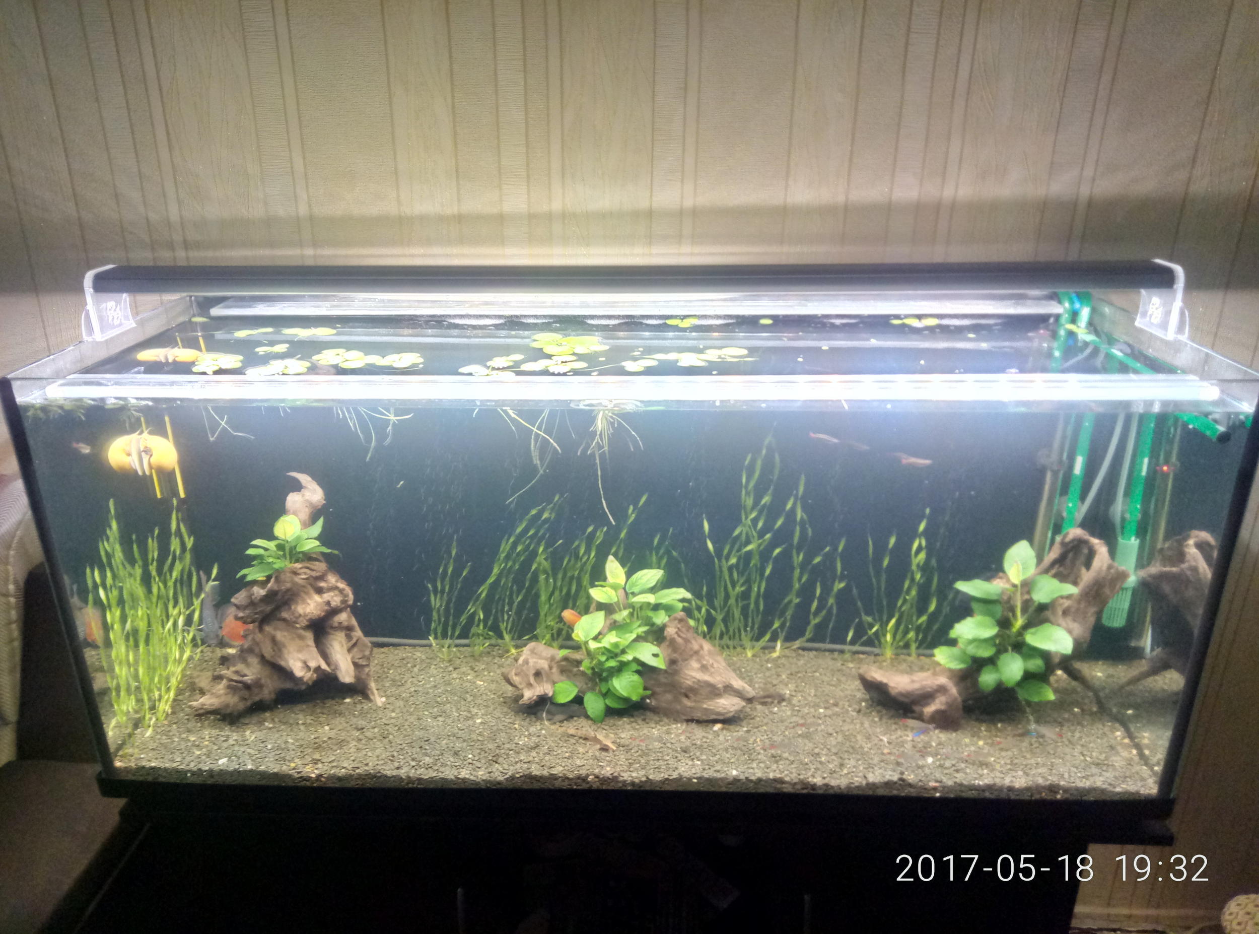 Сейчас стоит 4 лампы Т5 по 24 Вт . СО2. Растет норм, единственное бесит затемненные углы и куча ламп в крышке что не оч. удобно при уборке, да и воду греют прилично.