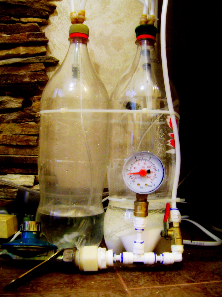 Запуск, он производится очень просто, перекрываем кран подачи СО2 в аквариум и сдавливаем рукой бутылку с кислотой, выдавив немного ее в соду, реакция начинается мгновенно и давление в обеих бутылках резко увеличивается (1-2,5 атмосферы).