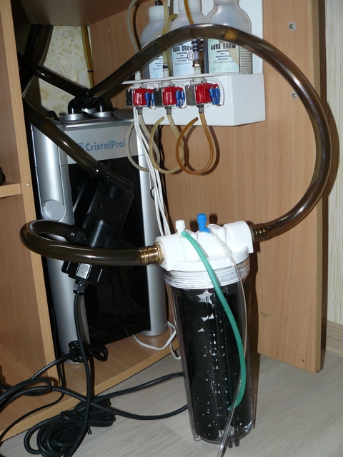 Купил колбу, засыпал ее шариками и подключил к фильтру.