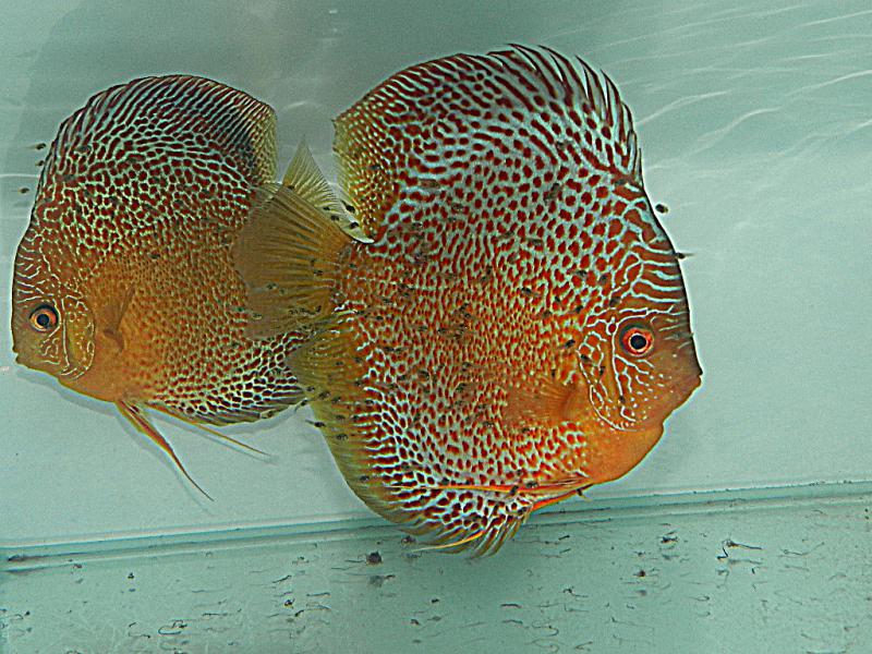 Та же рыба "в точечку", только папашей был Онлидискусовский самец Web Majestic (3 последних фото, предыдущие 2 - самка, Eruption), которые (в смысле маджестики) окрашивались еще хуже, но результатом наоборот доволен, при том, что никакого специального отбора не делал, успел оставить оставшихся, когда увидел, что одной из самых красивых самок из рабочих пар подходит - .