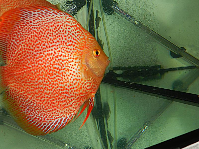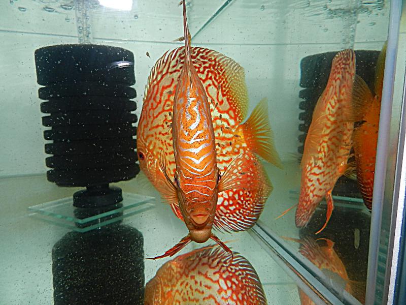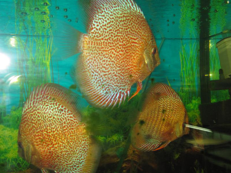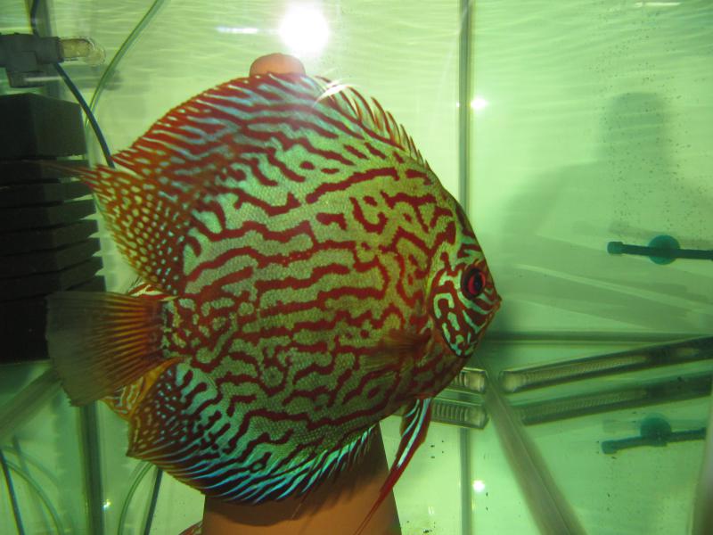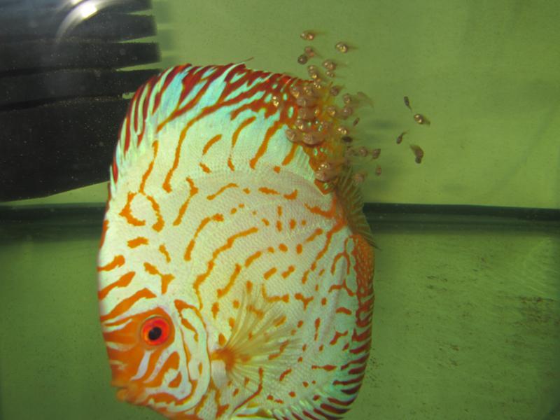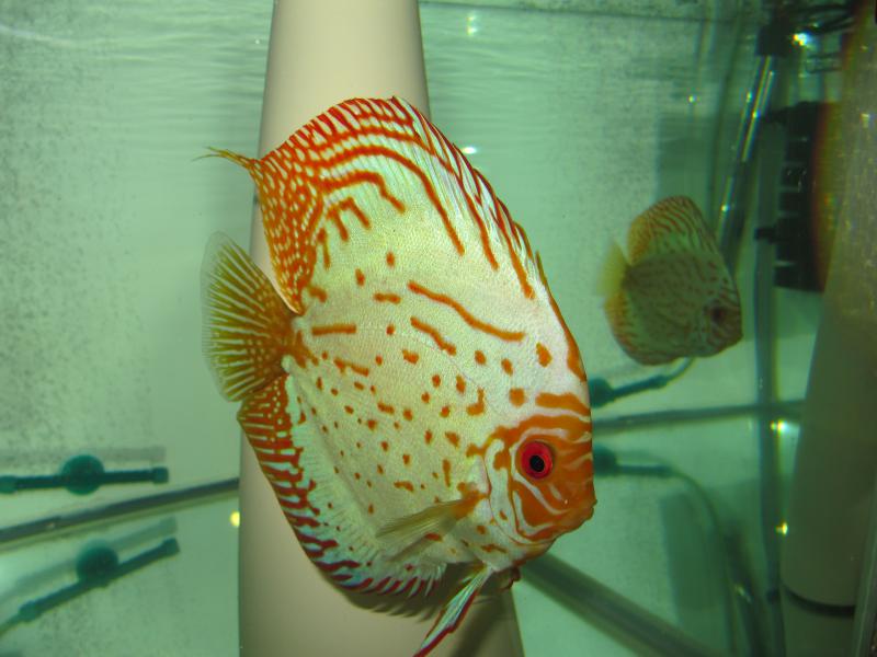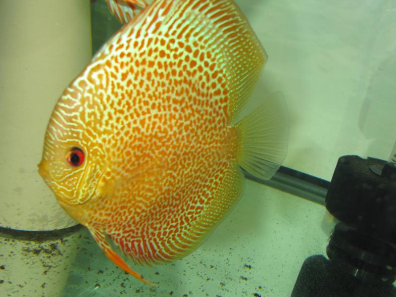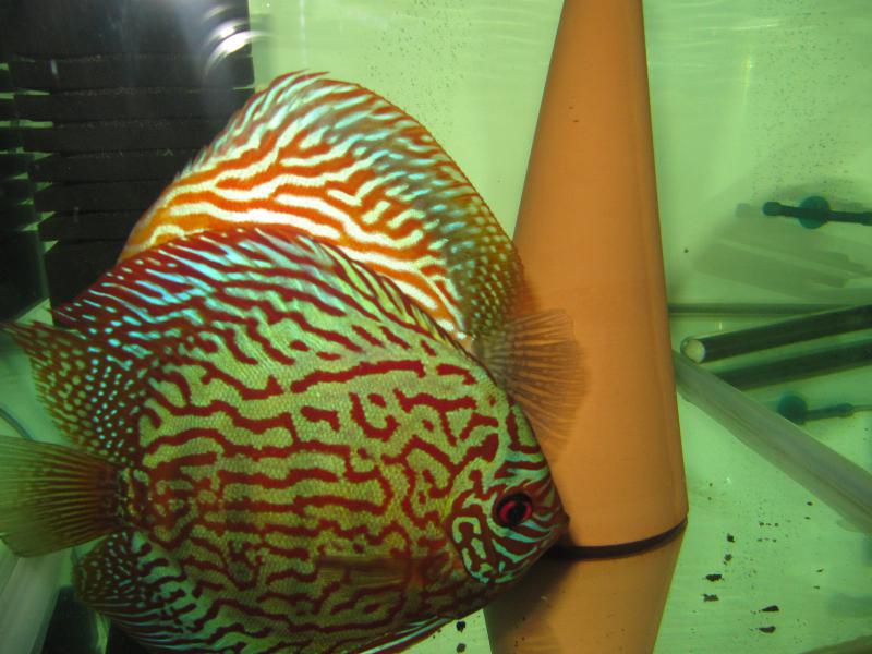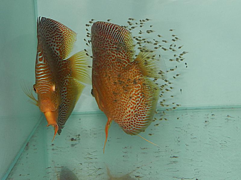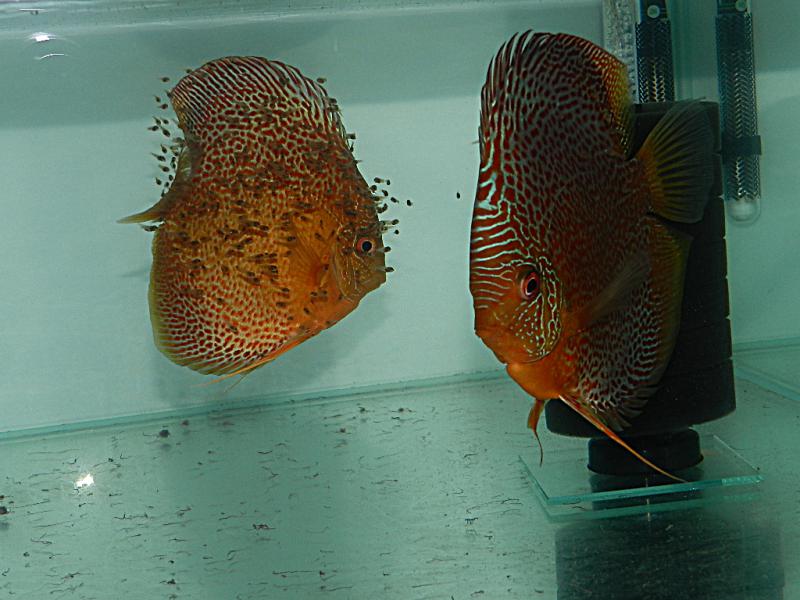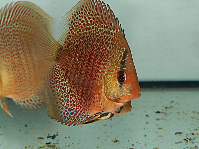 Та же рыба "в точечку", только папашей был Онлидискусовский самец Web Majestic (3 последних фото, предыдущие 2 - самка, Eruption), которые (в смысле маджестики) окрашивались еще хуже, но результатом наоборот доволен, при том, что никакого специального отбора не делал, успел оставить оставшихся, когда увидел, что одной из самых красивых самок из рабочих пар подходит - .