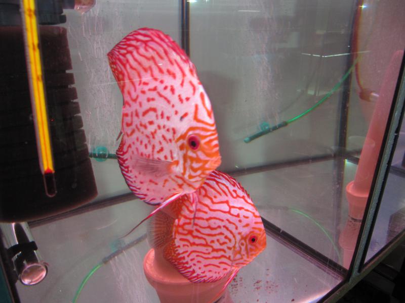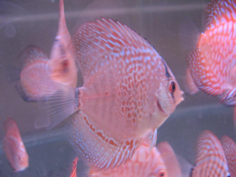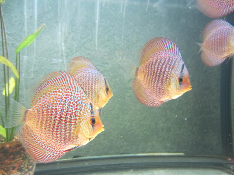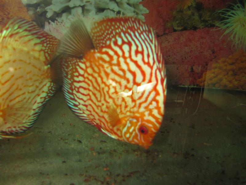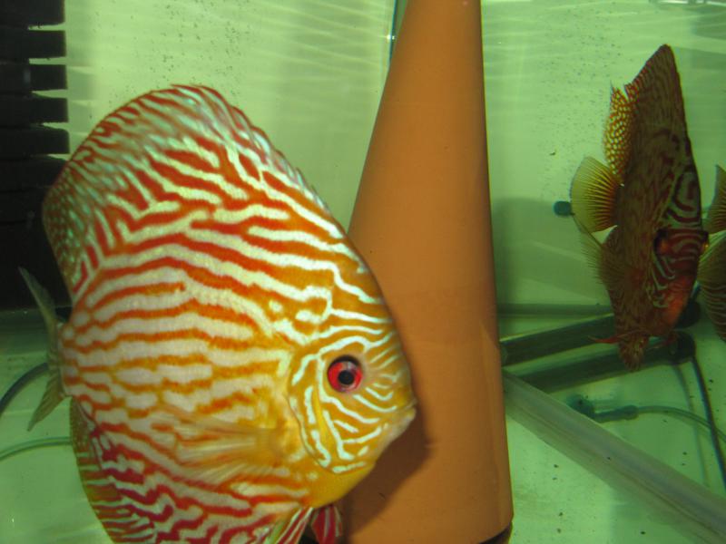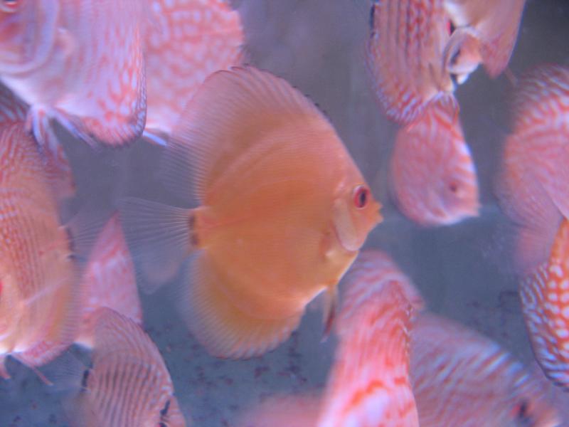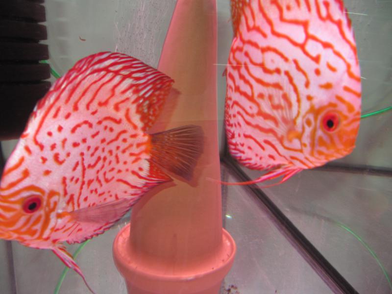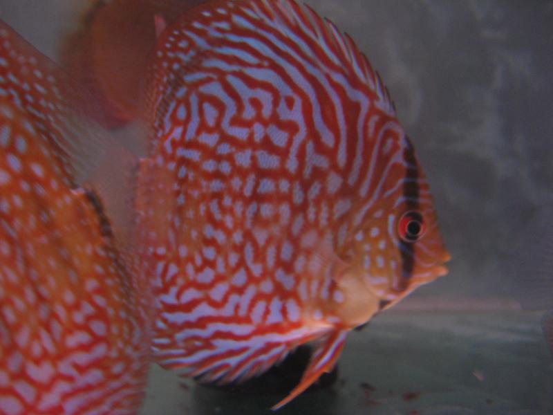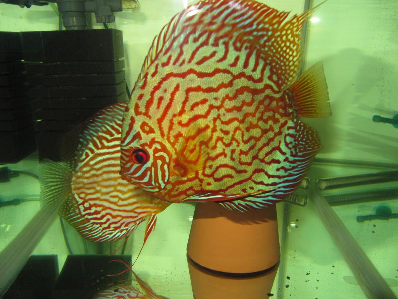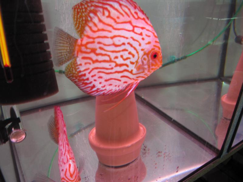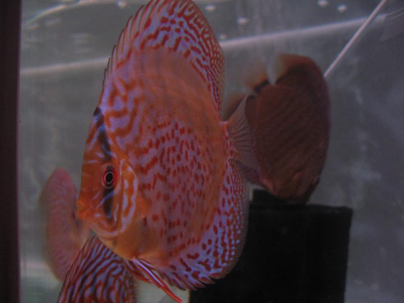 Та же рыба "в точечку", только папашей был Онлидискусовский самец Web Majestic (3 последних фото, предыдущие 2 - самка, Eruption), которые (в смысле маджестики) окрашивались еще хуже, но результатом наоборот доволен, при том, что никакого специального отбора не делал, успел оставить оставшихся, когда увидел, что одной из самых красивых самок из рабочих пар подходит - .