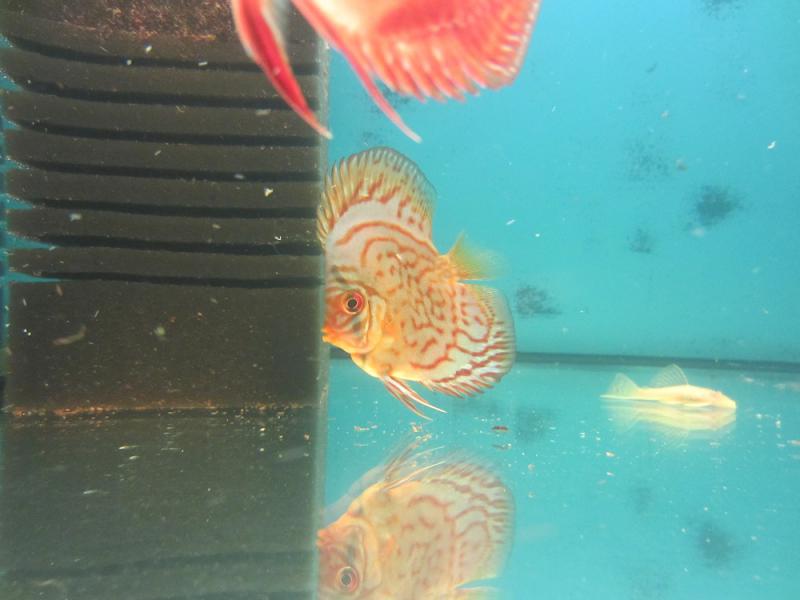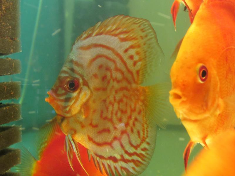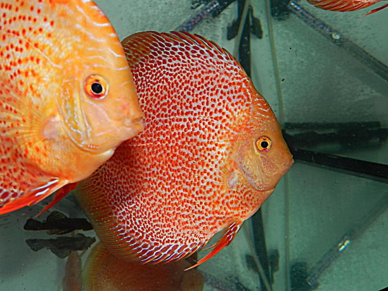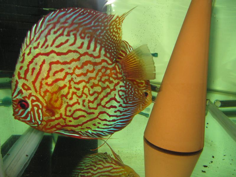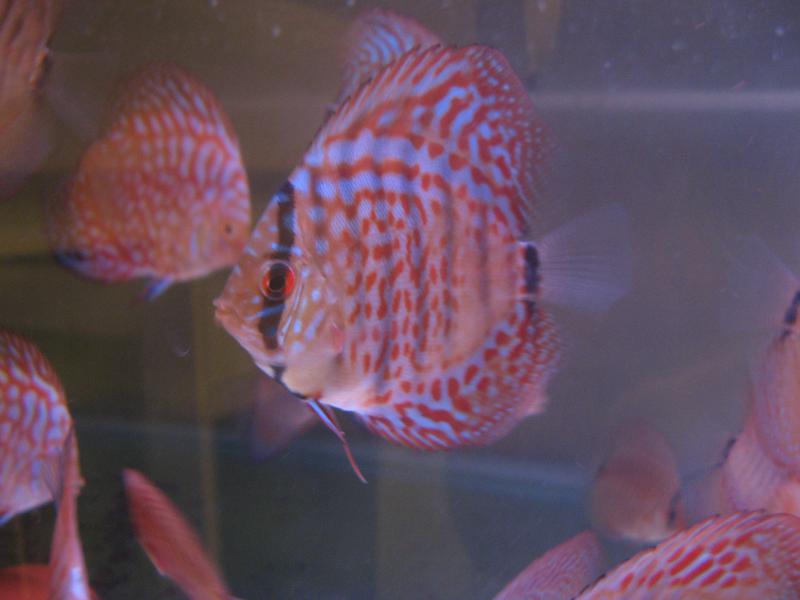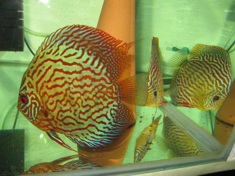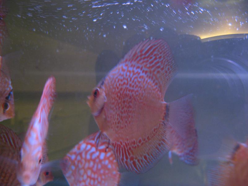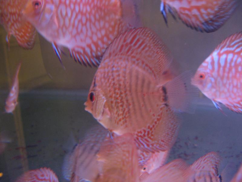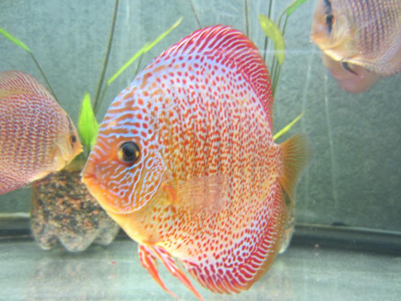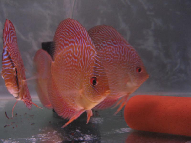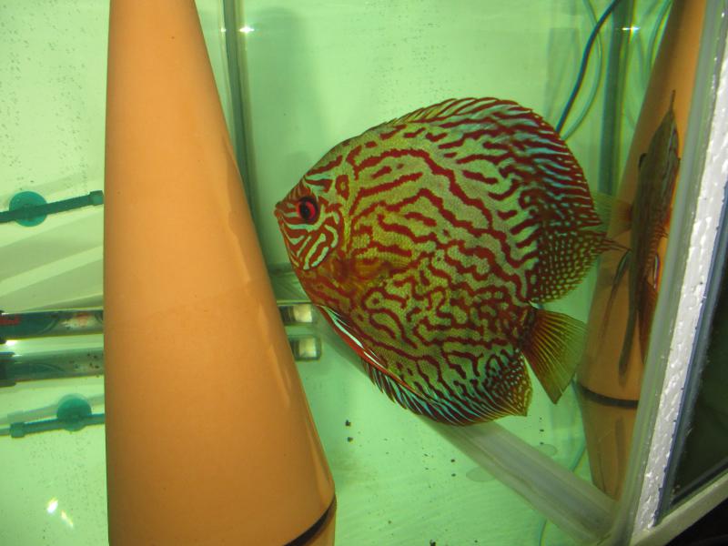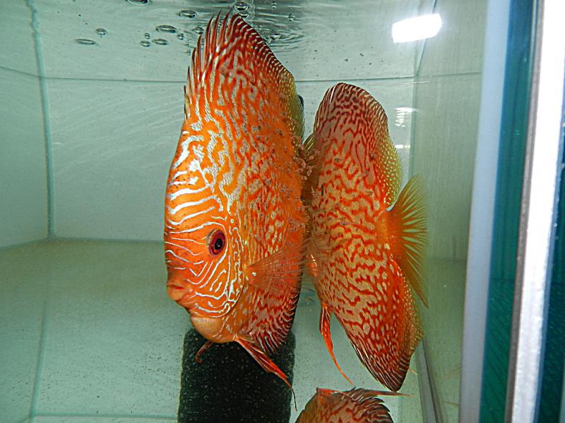 Та же рыба "в точечку", только папашей был Онлидискусовский самец Web Majestic (3 последних фото, предыдущие 2 - самка, Eruption), которые (в смысле маджестики) окрашивались еще хуже, но результатом наоборот доволен, при том, что никакого специального отбора не делал, успел оставить оставшихся, когда увидел, что одной из самых красивых самок из рабочих пар подходит - .