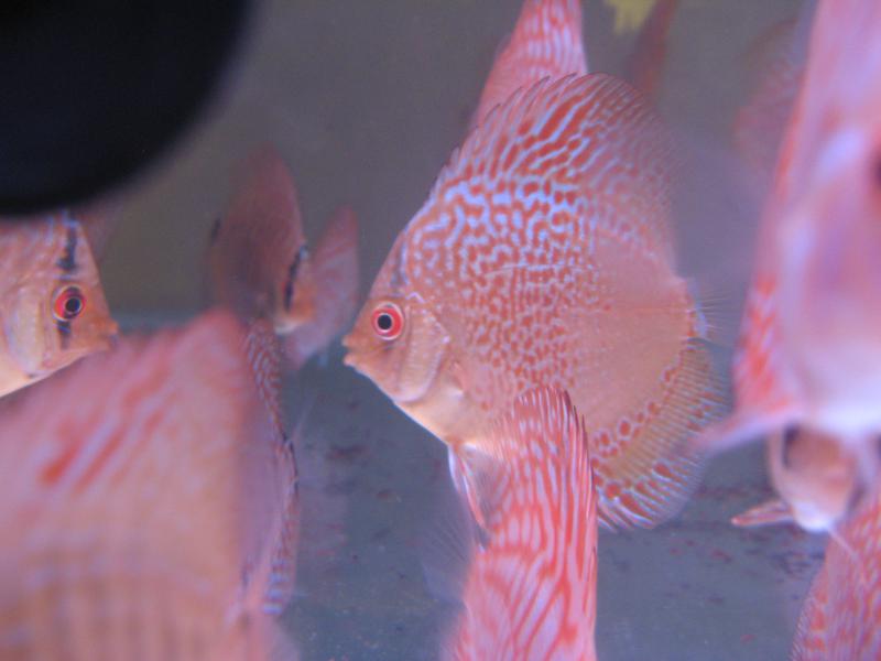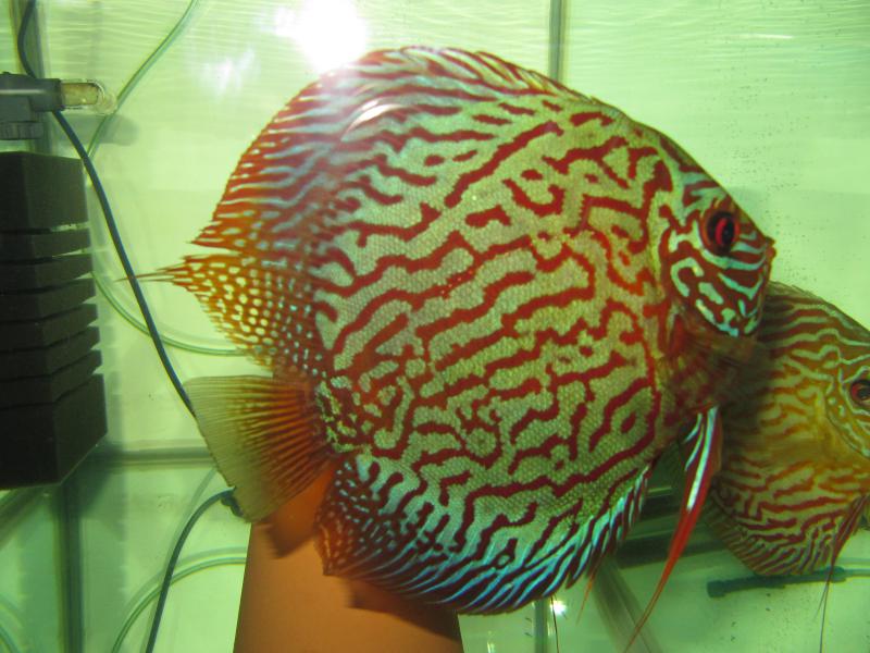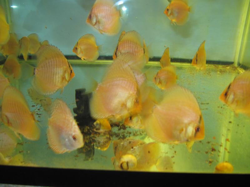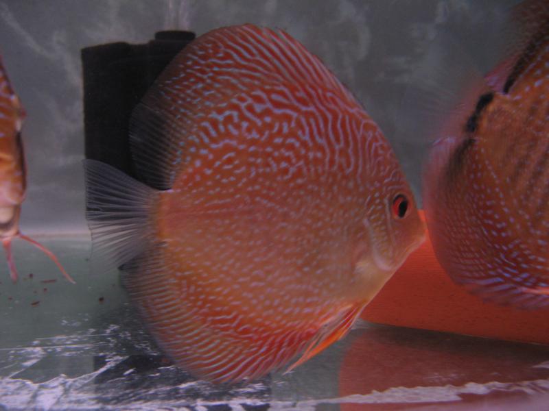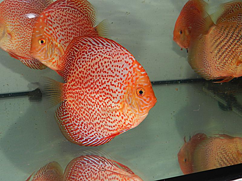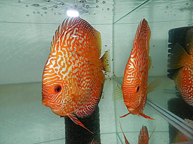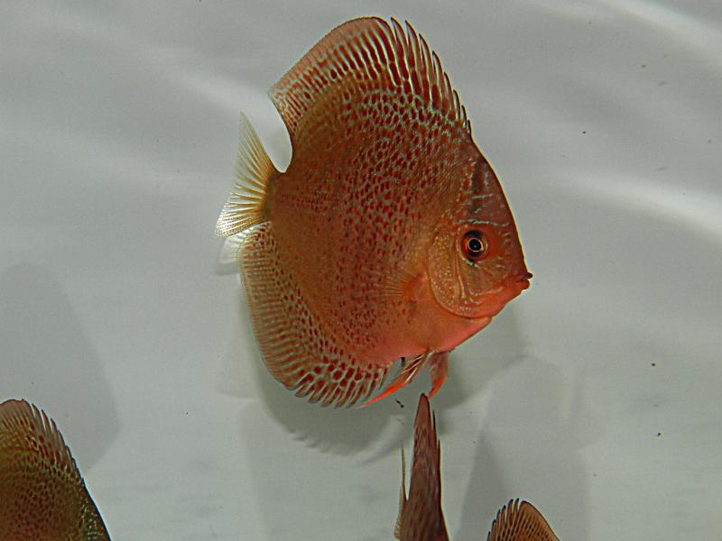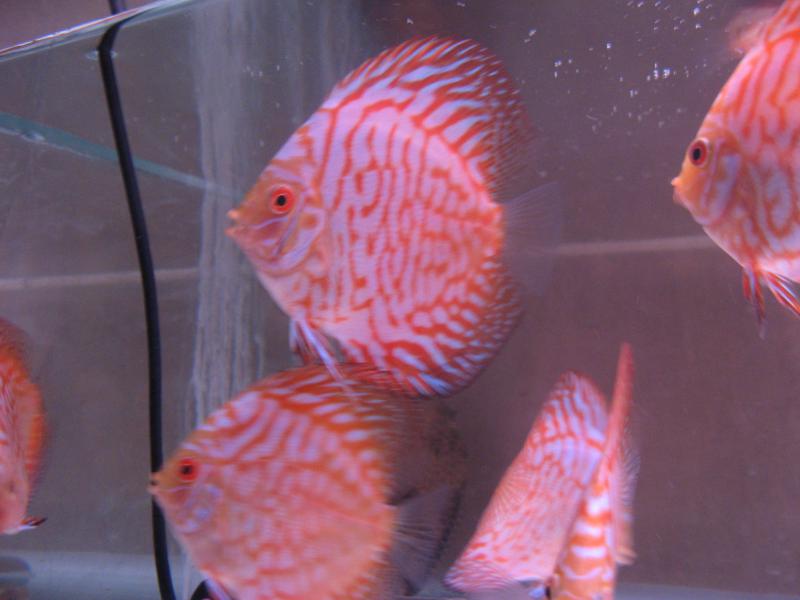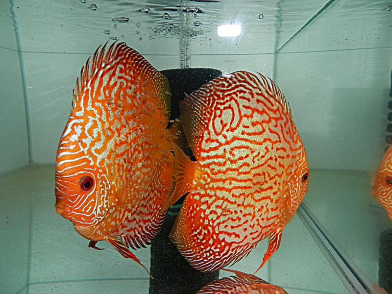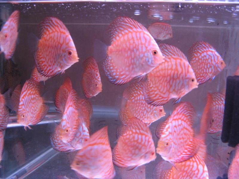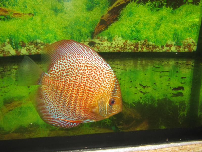 Та же рыба "в точечку", только папашей был Онлидискусовский самец Web Majestic (3 последних фото, предыдущие 2 - самка, Eruption), которые (в смысле маджестики) окрашивались еще хуже, но результатом наоборот доволен, при том, что никакого специального отбора не делал, успел оставить оставшихся, когда увидел, что одной из самых красивых самок из рабочих пар подходит - .