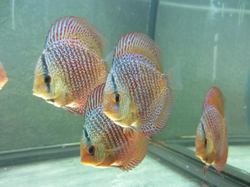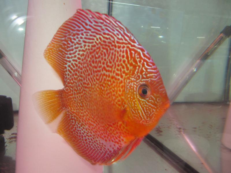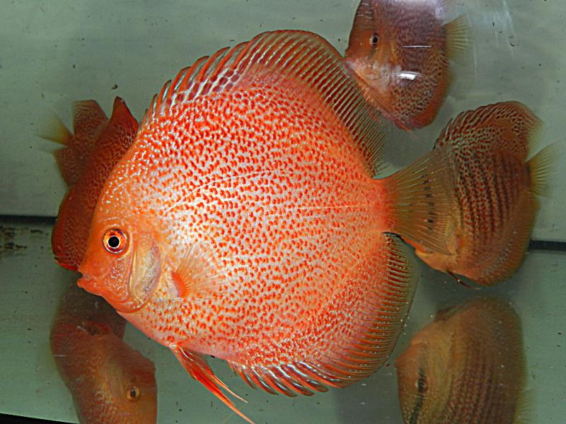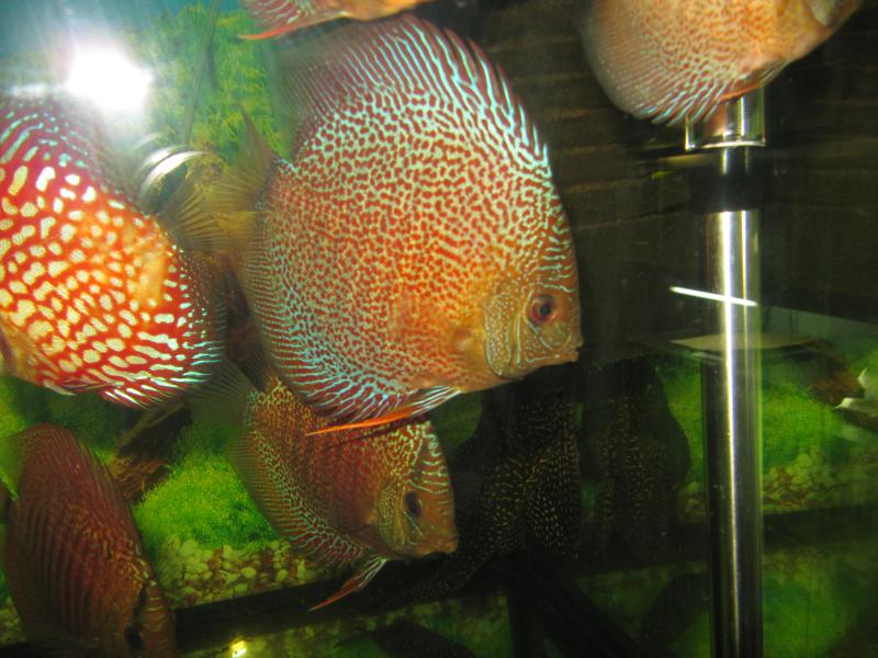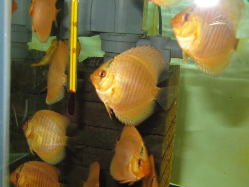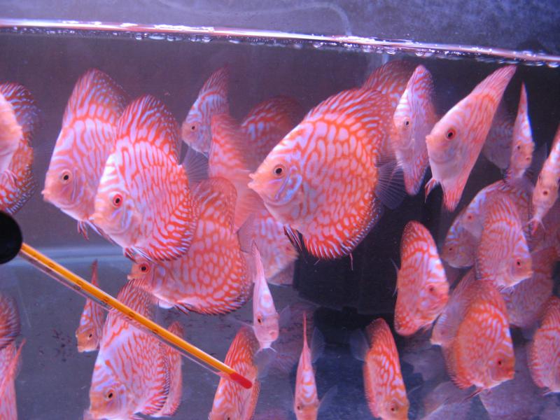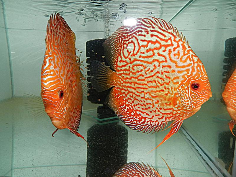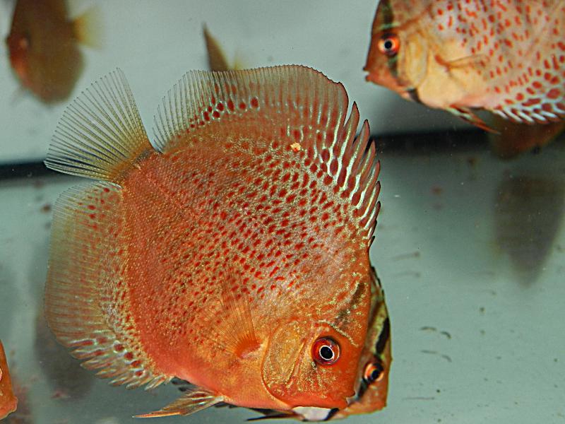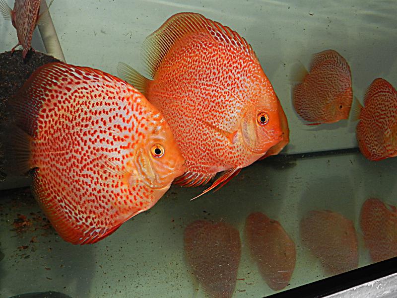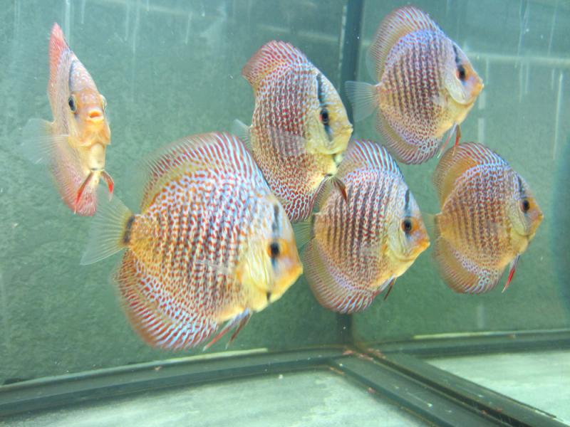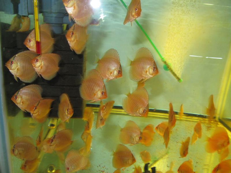 Та же рыба "в точечку", только папашей был Онлидискусовский самец Web Majestic (3 последних фото, предыдущие 2 - самка, Eruption), которые (в смысле маджестики) окрашивались еще хуже, но результатом наоборот доволен, при том, что никакого специального отбора не делал, успел оставить оставшихся, когда увидел, что одной из самых красивых самок из рабочих пар подходит - .