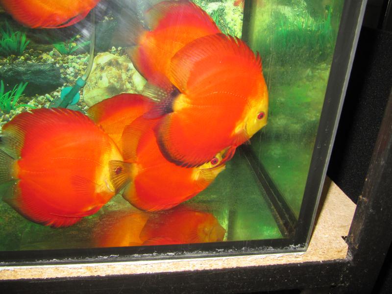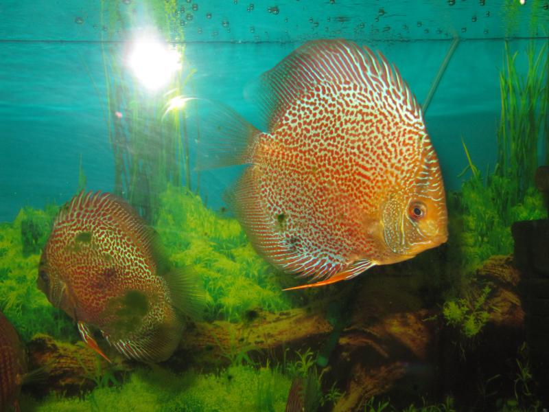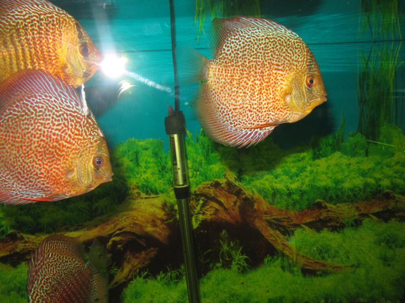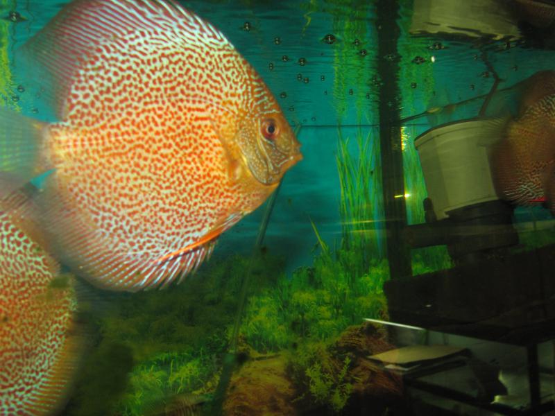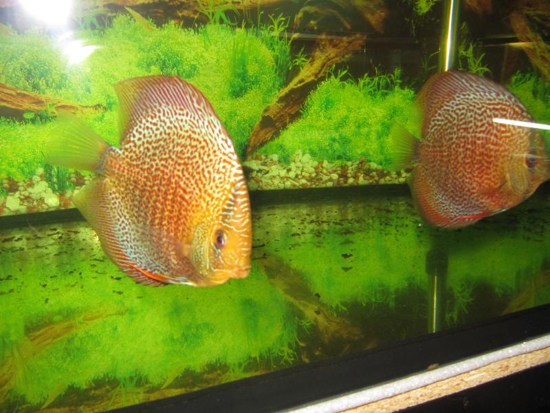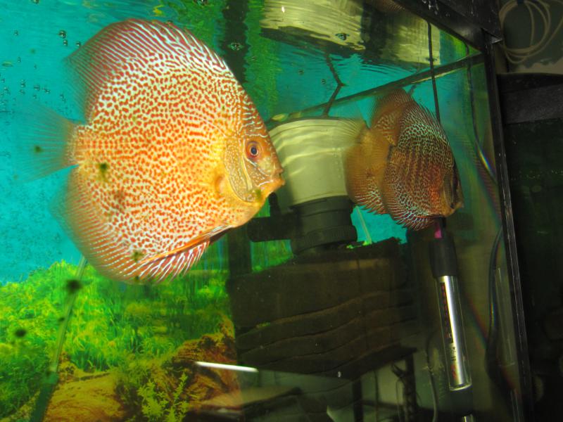 Начались эксперименты. Создал принудительно пару "по расчету", в свою пользу разумеется, прозвал ее "Евросоюз" - самка Rottürkis А.Пивоварски (Германия http://www.diskuszucht-piwowarski.de/), самец Red Turk. Checkerboard - Итальянец (S.G. Discuscoltura S.r.l. www.sgdiscus.com). Рыбины обе крупные, никак не могут определиться кто будет готовить к нересту субстрат, но от любви вроде не отказываются.... Время все решит
