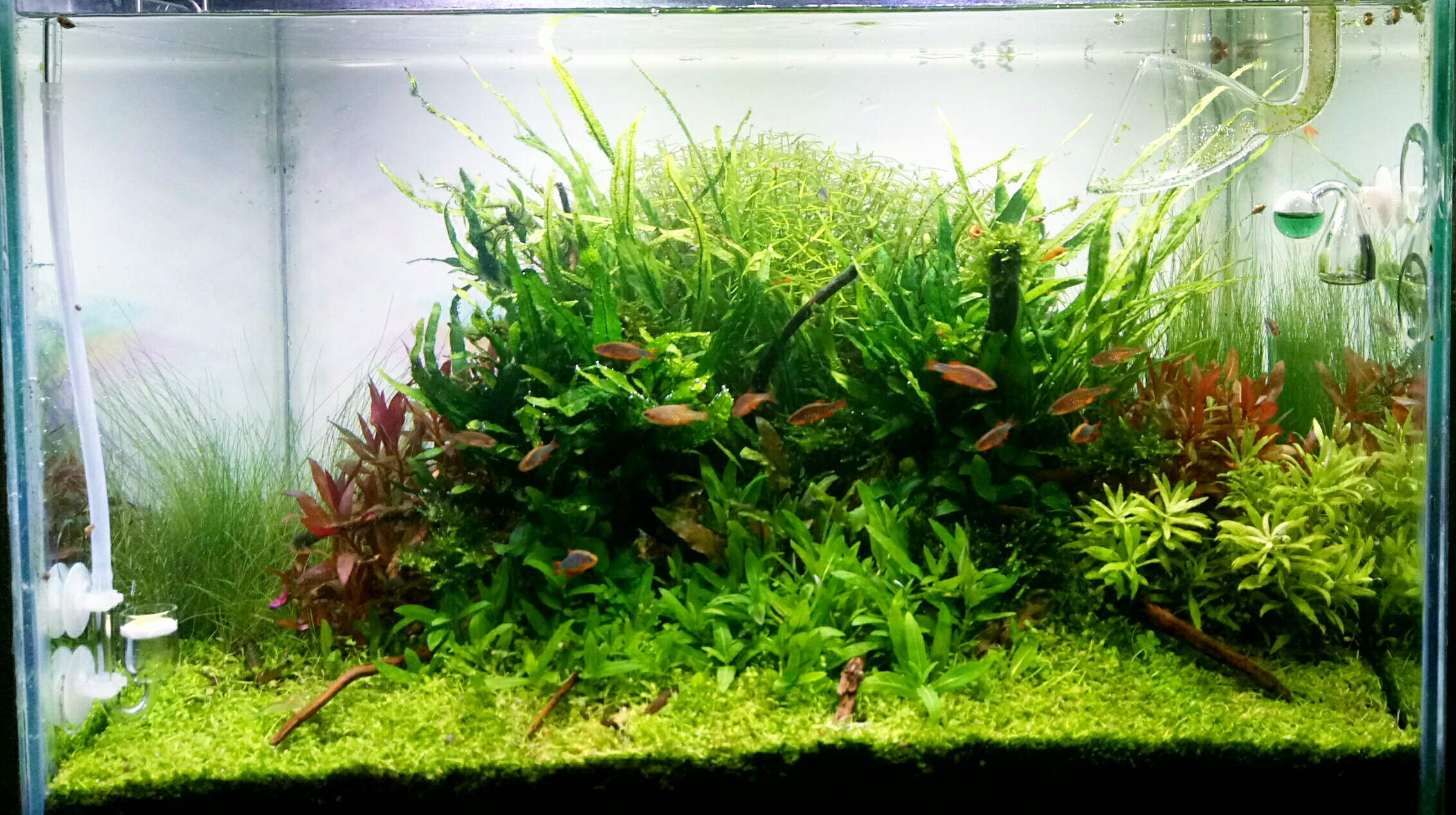 Пробував зменшувати світло, без толку, водорості ростуть повільніше і монте карло тягнеться вгору. Пробував більше добрива давати, склалось враження, що ще швидше водорості ростуть. Зменшив комплекс до 1 мл на день, на водорослі це не вплинуло, а от Таїландська папороть протягом тижня місцями почорніла і почала масово діток давати. Поміряв нітрати(тест Птеро, точність плюс мінус так собі) - наміряв щось середнє між 2 мг/л і 5 мг/л. по кольору аналогічно з тим що у водопроводі. Раніше нітрати були 10 мг/л, але ж знову таки тест не точний. Плюс за цей тиждень ксенококус з'явився.