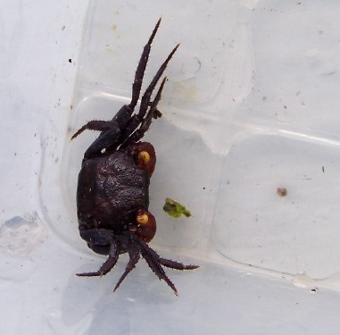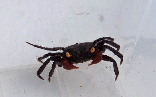 В банке с нотофорумами попалась на глаза самка необычной окраски. Чёрного цвета, с менее оранжевыми глазами чем у вампира, хотя клешни фиолетовые. Вариация окраски, или может всё-таки какой-то гибрид?