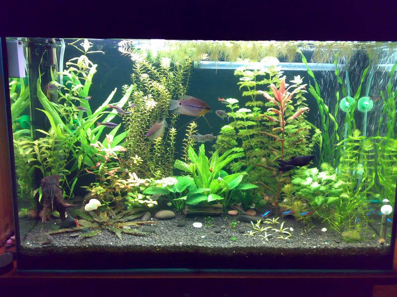 Фильтр-Tetratec EX700,температура-26грд.УДО-Флорастим-макро,микро-через день,СО-Tetra optimat.Жители:жемчужные гурами-пара,неоны-6шт.кардиналы-8шт.каридорасы-4шт.королевская тетра-5шт.тетра фонарик-7шт.анцитрусы-3шт.моллинезия-пара,лабео биколор,сиамский водорослеед,черики-5шт.креветка фильтратор(бамбуковая),ампулярии-4шт.Вода-подмена каждую субботу-25-30л.Не сифоню из-за подложки,чистка фильтра по мере падения напора воды,вода отстоянная без добавок.Параметры воды-pH-7,5-8,Gh-12,kH-5-6.