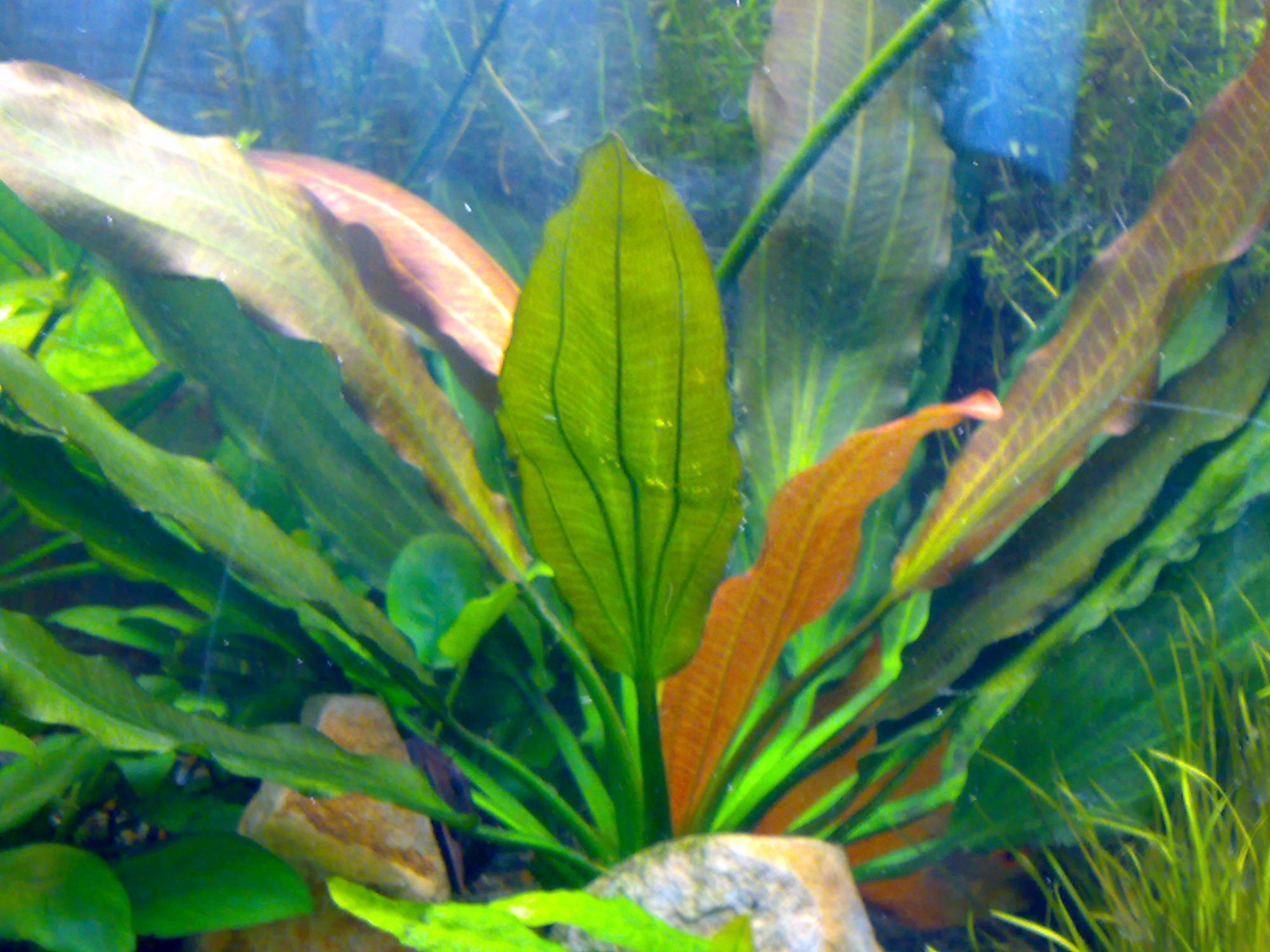 Вик@, У везувия листья по ширине будут шире чем у нежного рубра. У меня Эх нежный рубра, в разных аквариумах имеет разный окрас листьев от зелёного до красного (красные листья растут в акве где лампы сильвания gro-lux), в акве с энергосберегалкой Osram 827 край листа коричневеет, а в акве с энергосберегалкай Delux 4100 зелёные листья