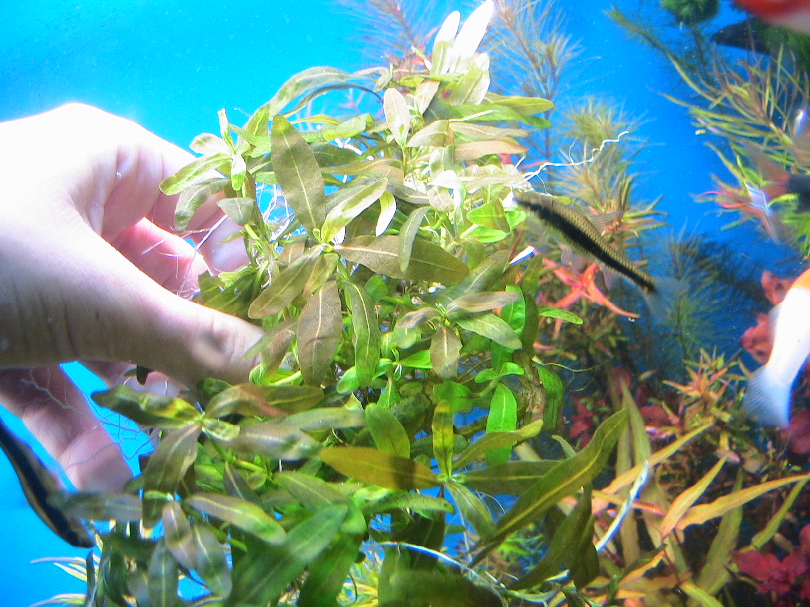 на остальных двух - неизвестное пока мне растение, которое я как-то в бонус получил от Шамана, вроде бы как зеленая альтернантера. сразу оно приживалось крайне плохо: чернело, крючилось и т.д., пока я его не пересадил в другой аквариум, с другим грунтом, подальше от глаз - авось выживет. и забыл. и вот недавно, убрав корягу, заметил какую-то незнакомую новую веточку - вспомнил