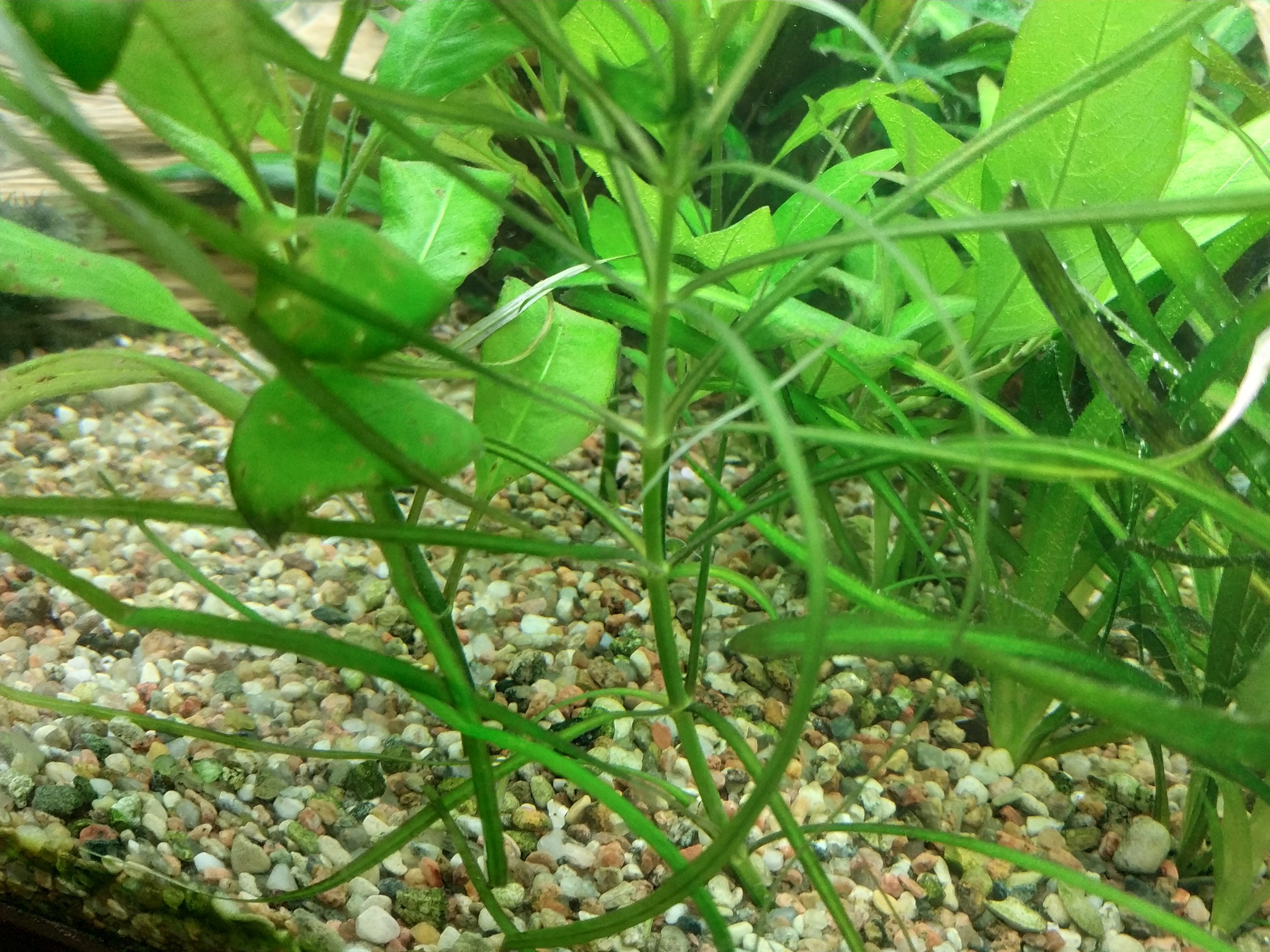 Подскажите, пожалуйста, что за растение на заднем плане около фильтра? С одного узла по 4 длинных листа растет.