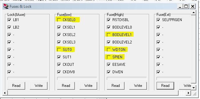 - для ATtiny2313 - CKSEL0, SUT0, BODLEVEL1, WDTON, SPIEN