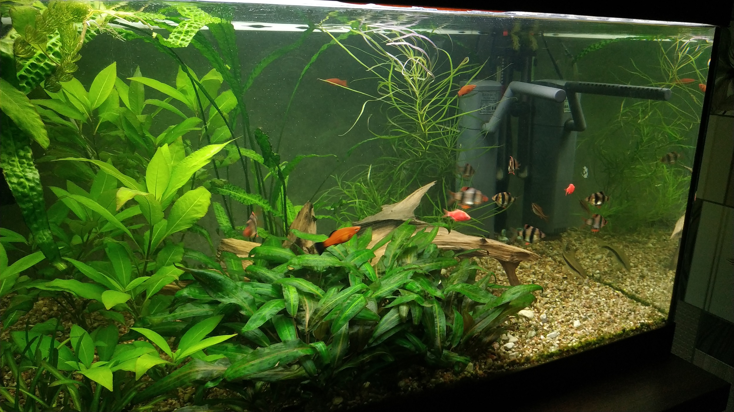 Подскажите, пожалуйста, что за растение на заднем плане около фильтра? С одного узла по 4 длинных листа растет.